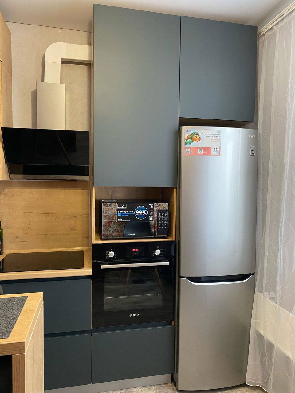 Темные и светлые фасады из пленочной МДФ. Ширина кухни 210 см.