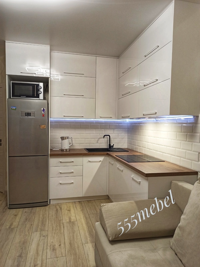 Белые матовые фасады из акрила. Фурнитура: Blum (Австрия).