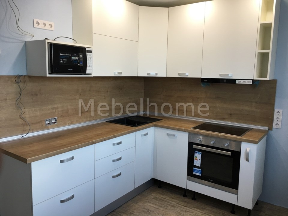 Угловая кухня с белыми матовыми фасадами