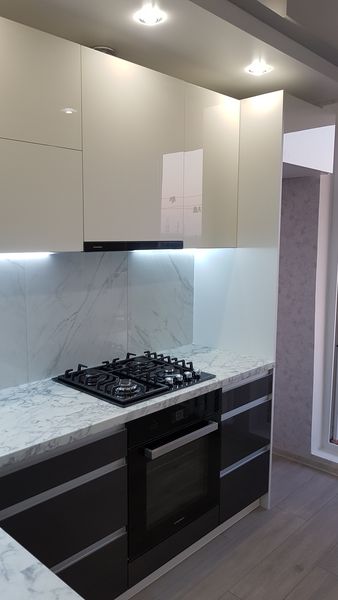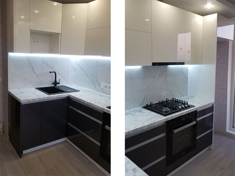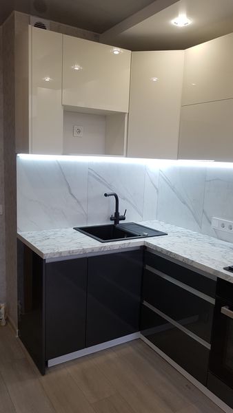 Угловая кухня с черно-белыми глянцевыми фасадами