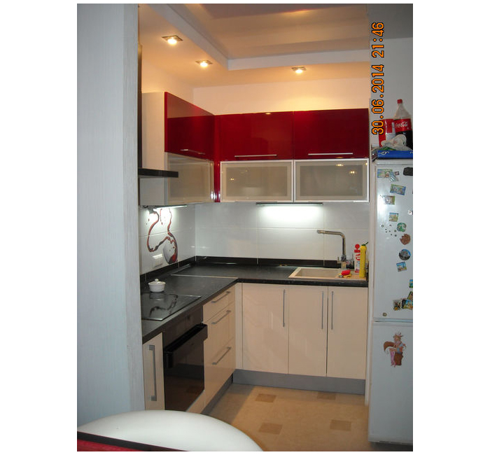 Компактная угловая кухня отличается интересной цветовой гаммой в ее оформлении. Нижние шкафчики декорированы в ненавязчивый бежевый цвет. Ряд навесных модулей выкрашены в насыщенный красный цвет, остальные остеклены матовым стеклом. Вместительная столешница черного цвета удачно гармонирует с цветовой палитрой гарнитура.