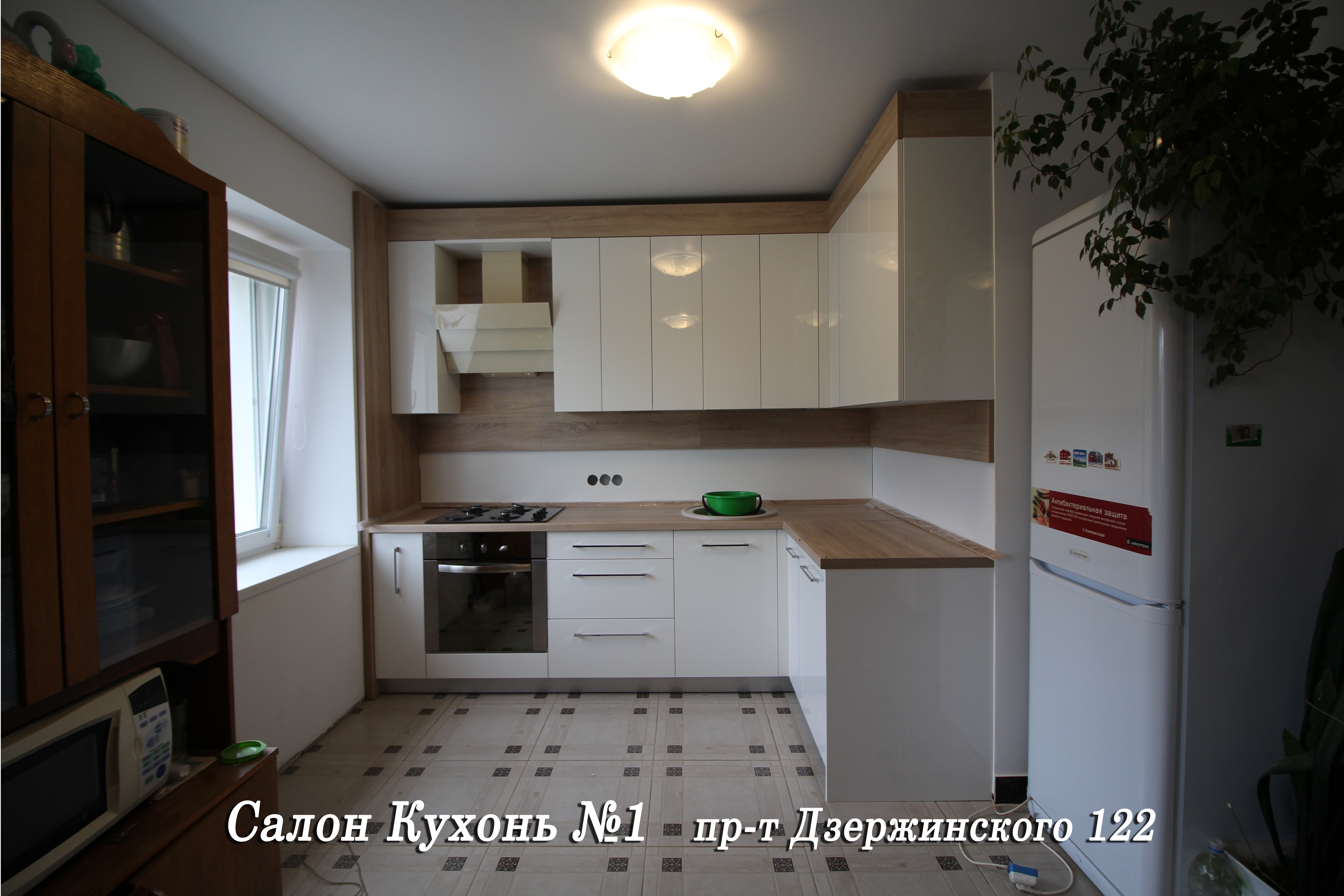 Универсальный белый цвет комплекта для кухни с эффектным глянцем, верхняя часть модулей без фурнитуры, разделена на узкие, вертикальные, выдвижные ящики для хранения. Ниша для вытяжки и встроенное пространство для плиты. Столешница и оформление фасадов под «орех».