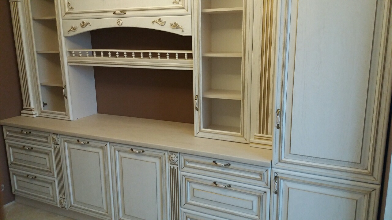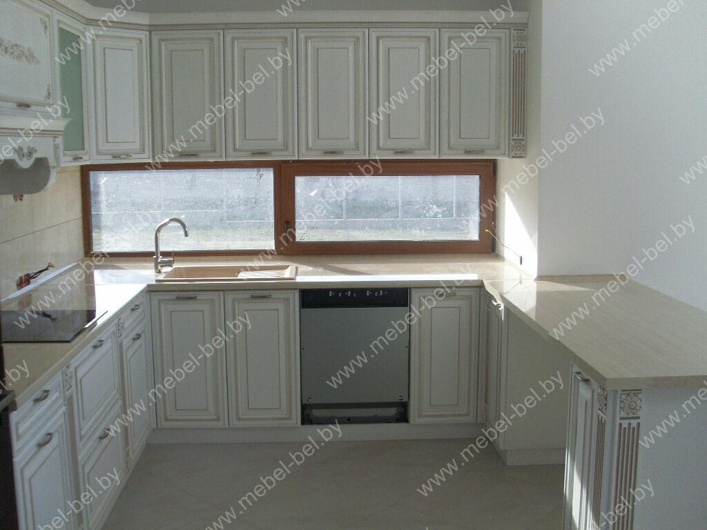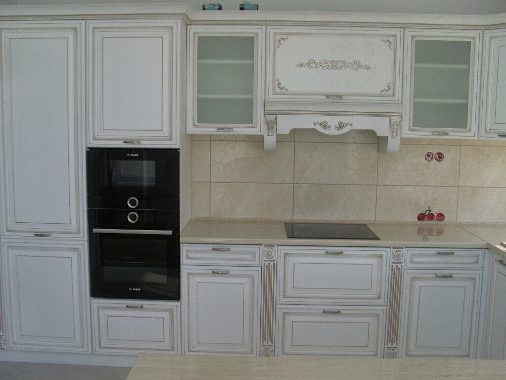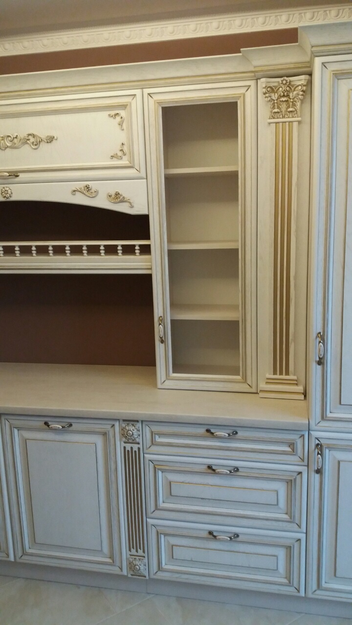 Классический кухонный гарнитур выполнен из качественного массива. Эффект патинирования придает кухне ощущение долговечности и прочности. Модель оснащается самым разнообразным функционалом: открытыми полками, закрытыми полками, шкафчиками с ярусами. Столешница делится на несколько зон, которые смогут использоваться под готовку и прием пищи.