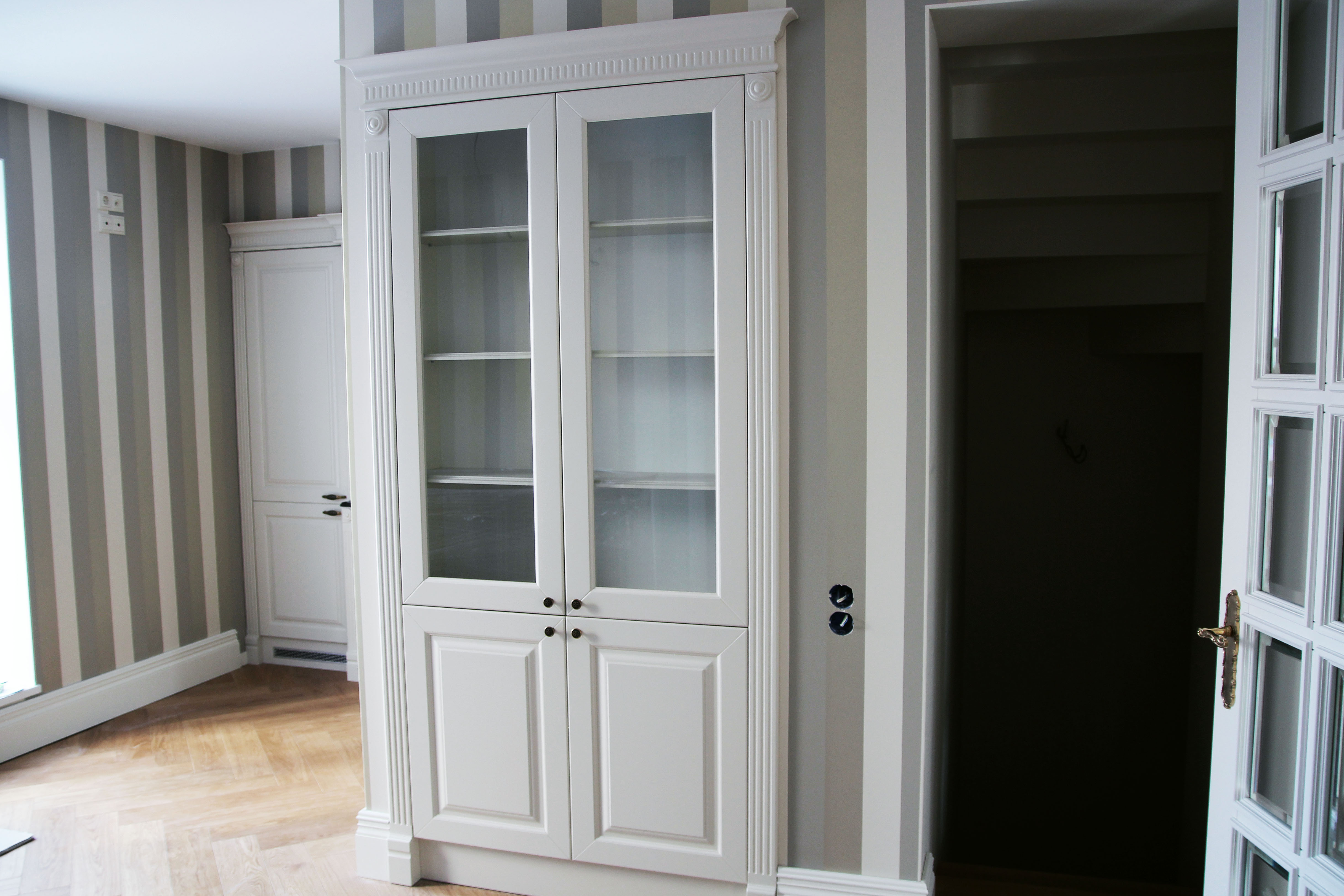 Фурнитура отличается разнообразием. В шкафчиках с остекленными створками используются круглые ручки, в других ящиках и шкафчиках применяется традиционная фурнитура с ручками-скобами.
