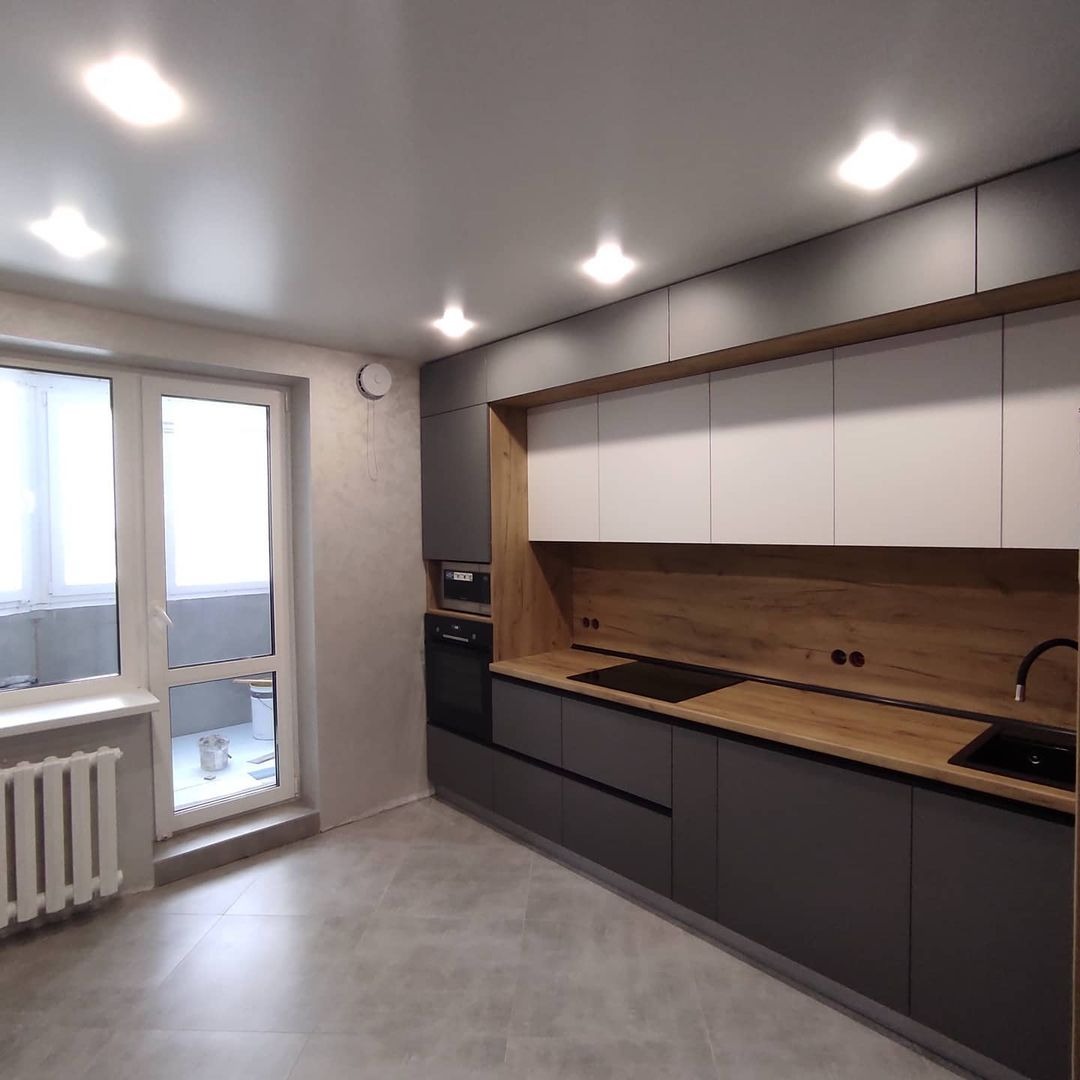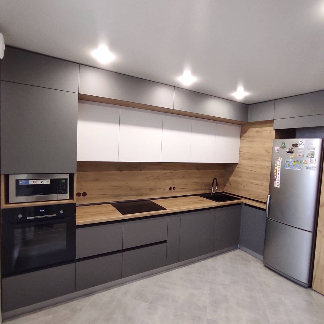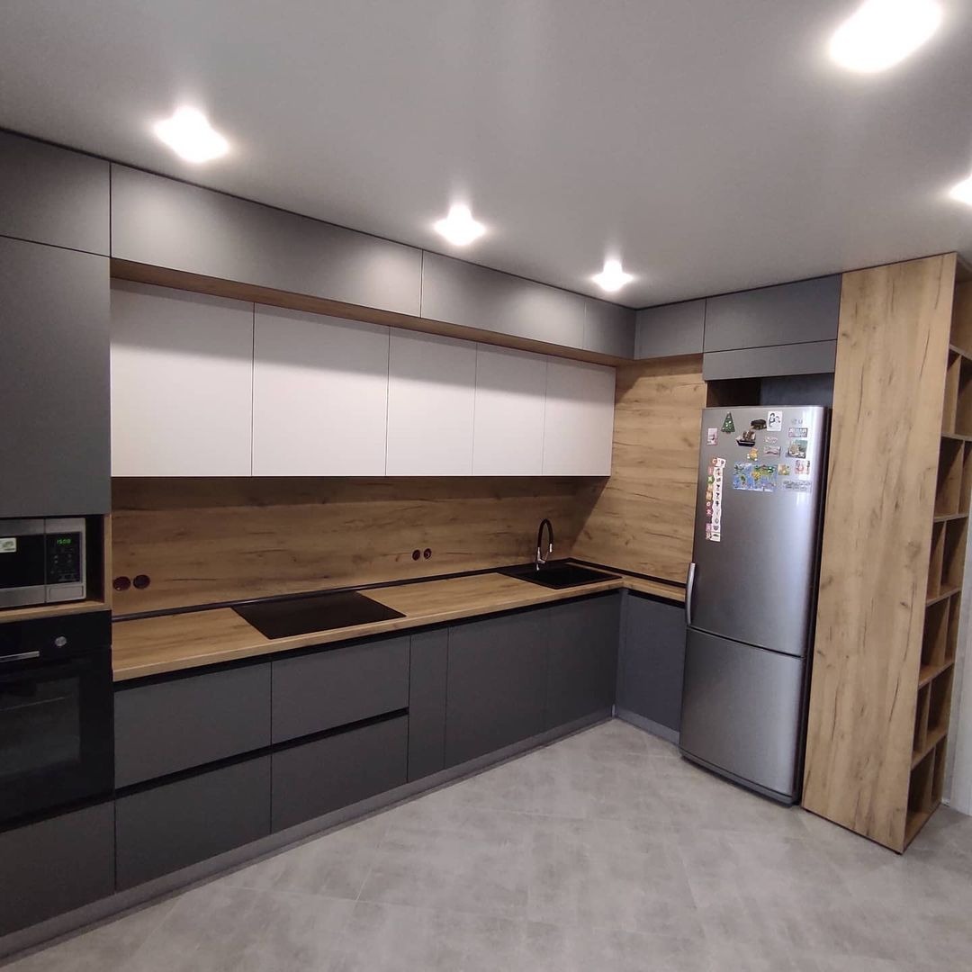 Угловая кухня 150х140 см с темными и светлыми фасадами.