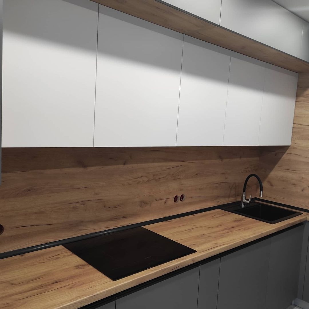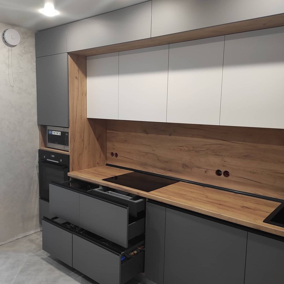 Однотонный древесный цвет фасадов из ЛДСП. Ширина кухни 140 см.
