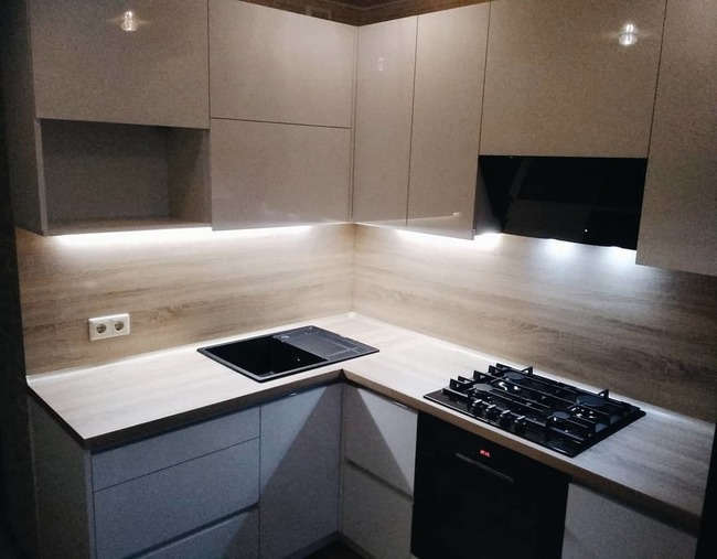 Верхние фасады со стеклом. Ширина кухни 120 см.