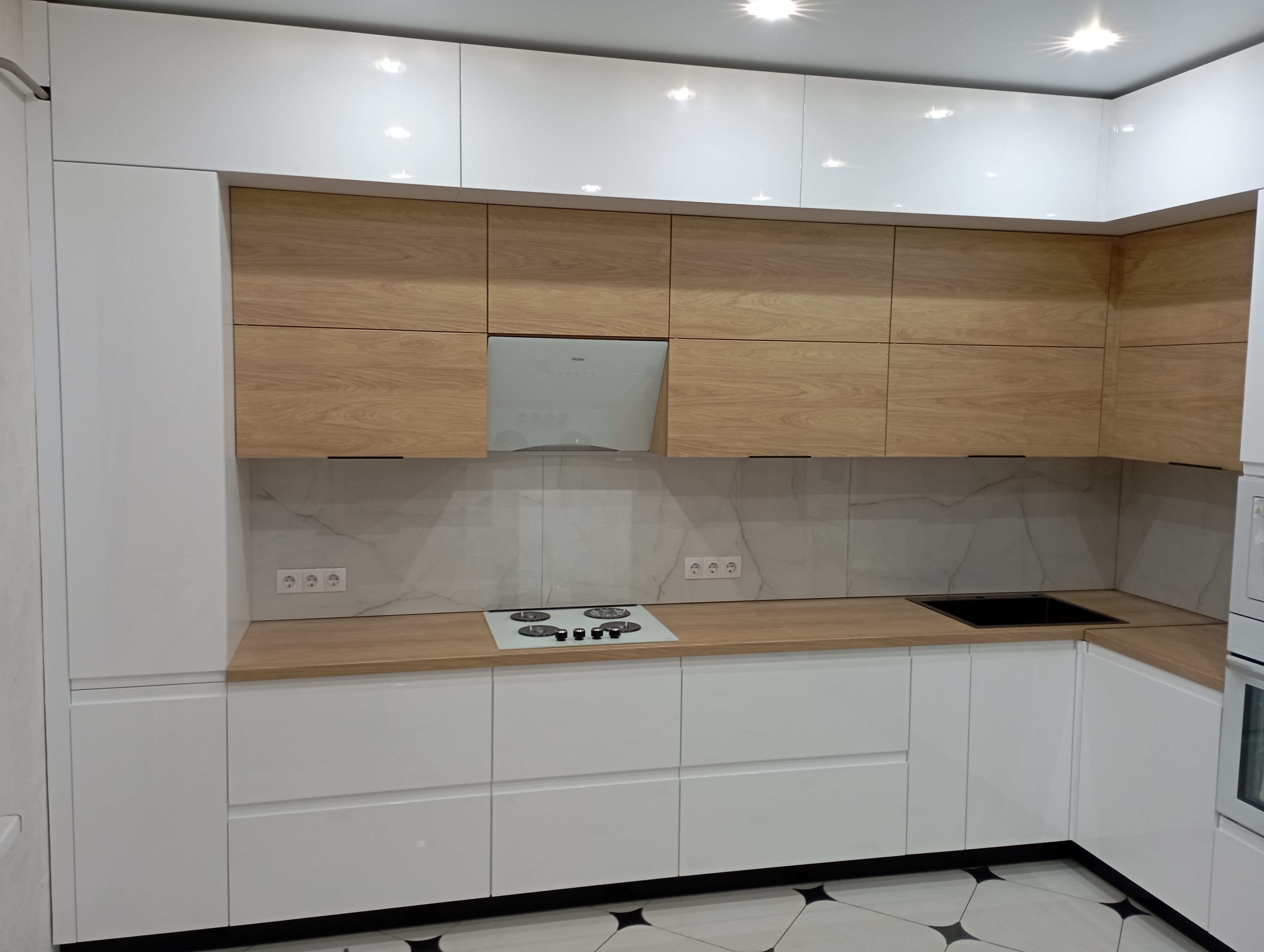 Материал фасада и корпуса: ЛДСП 16 мм. Ширина кухни 260 см.