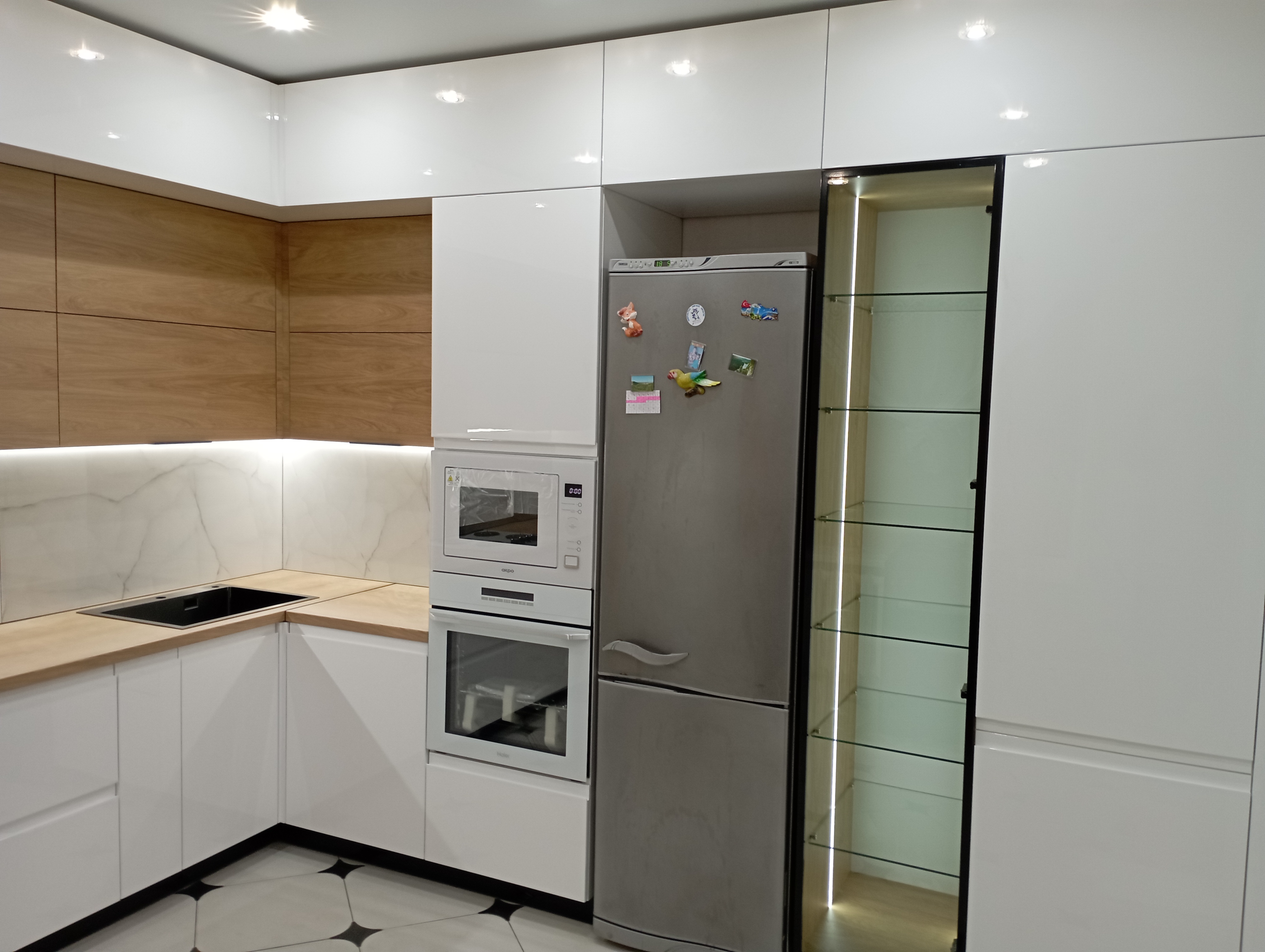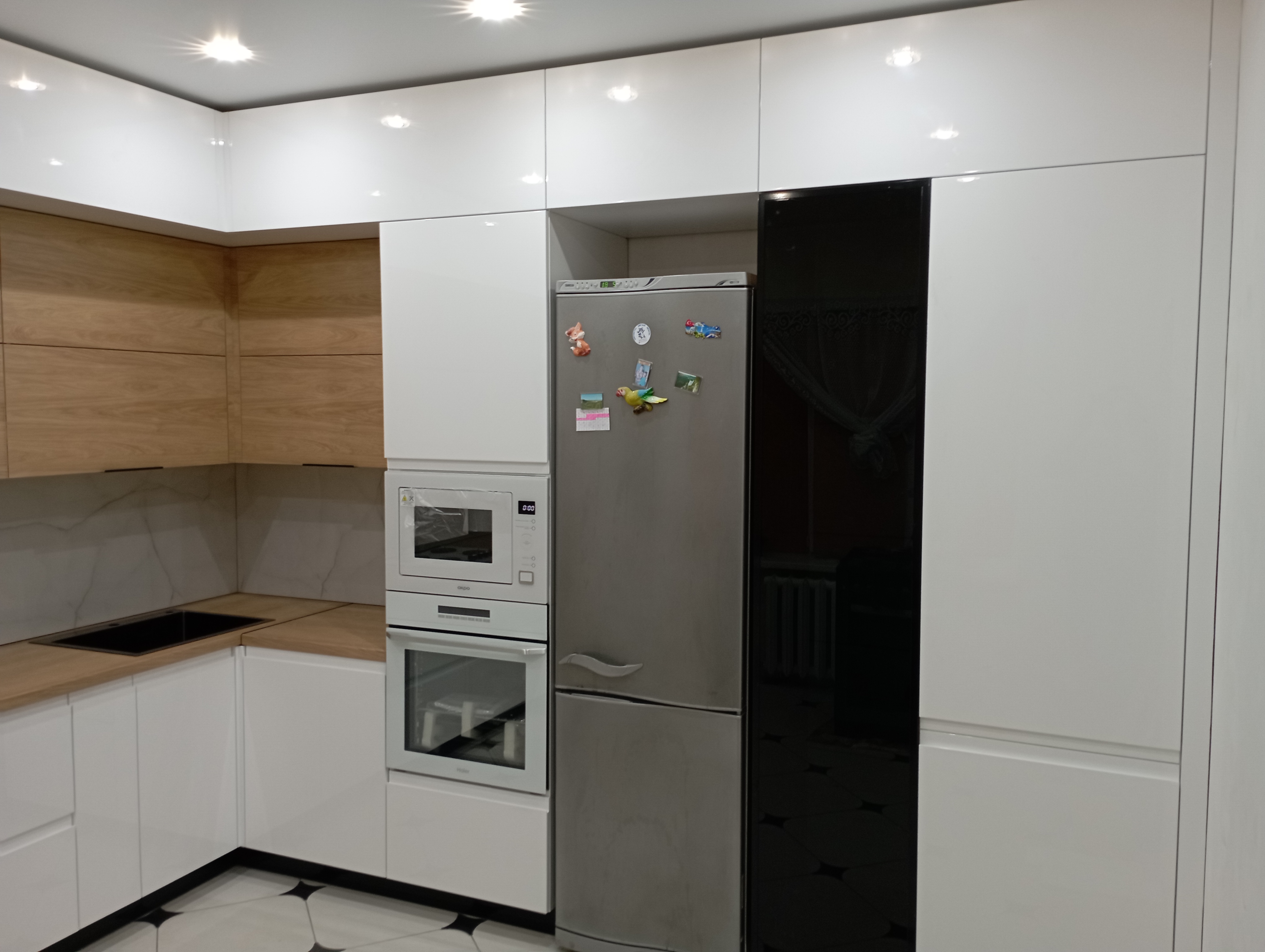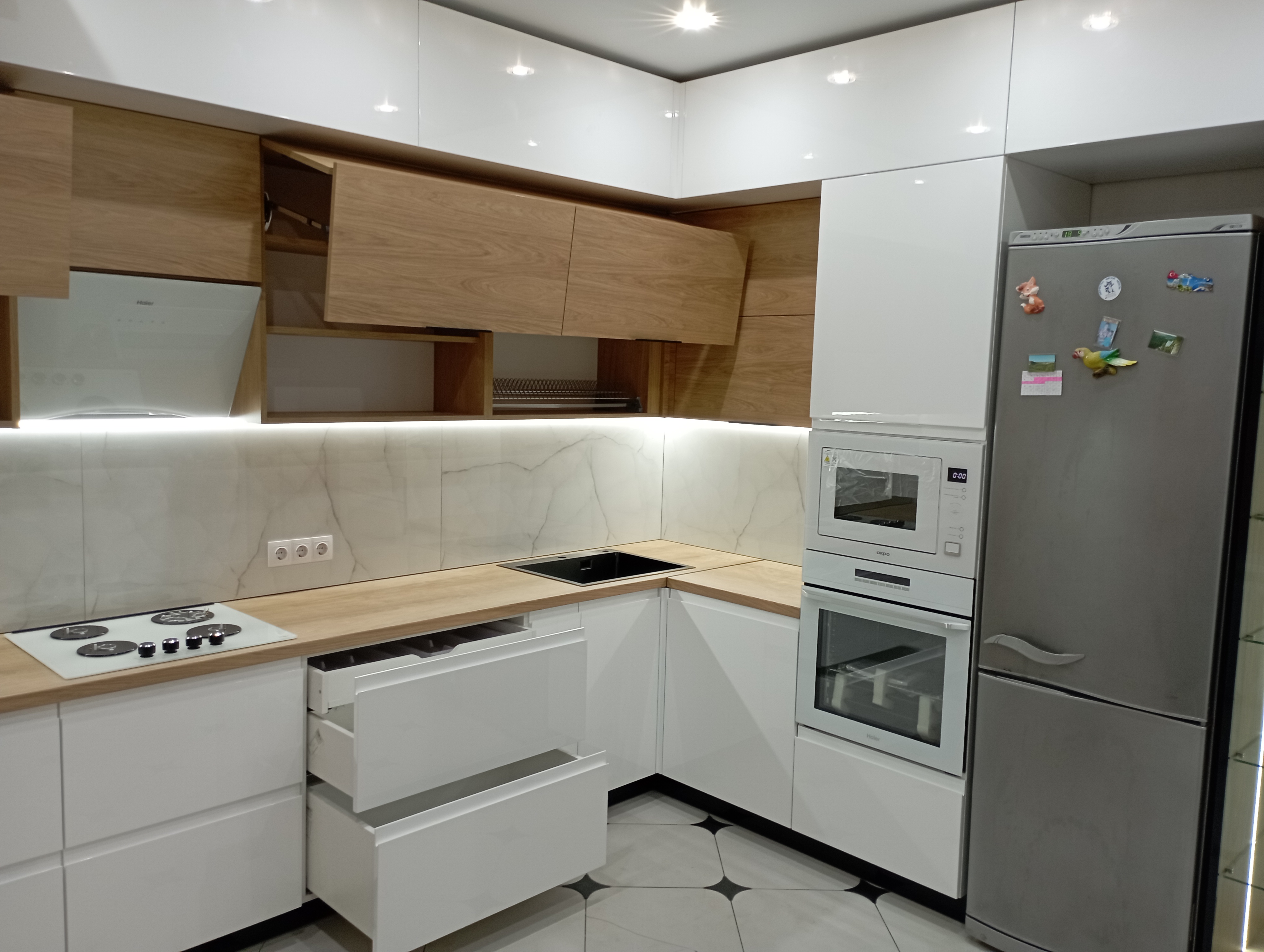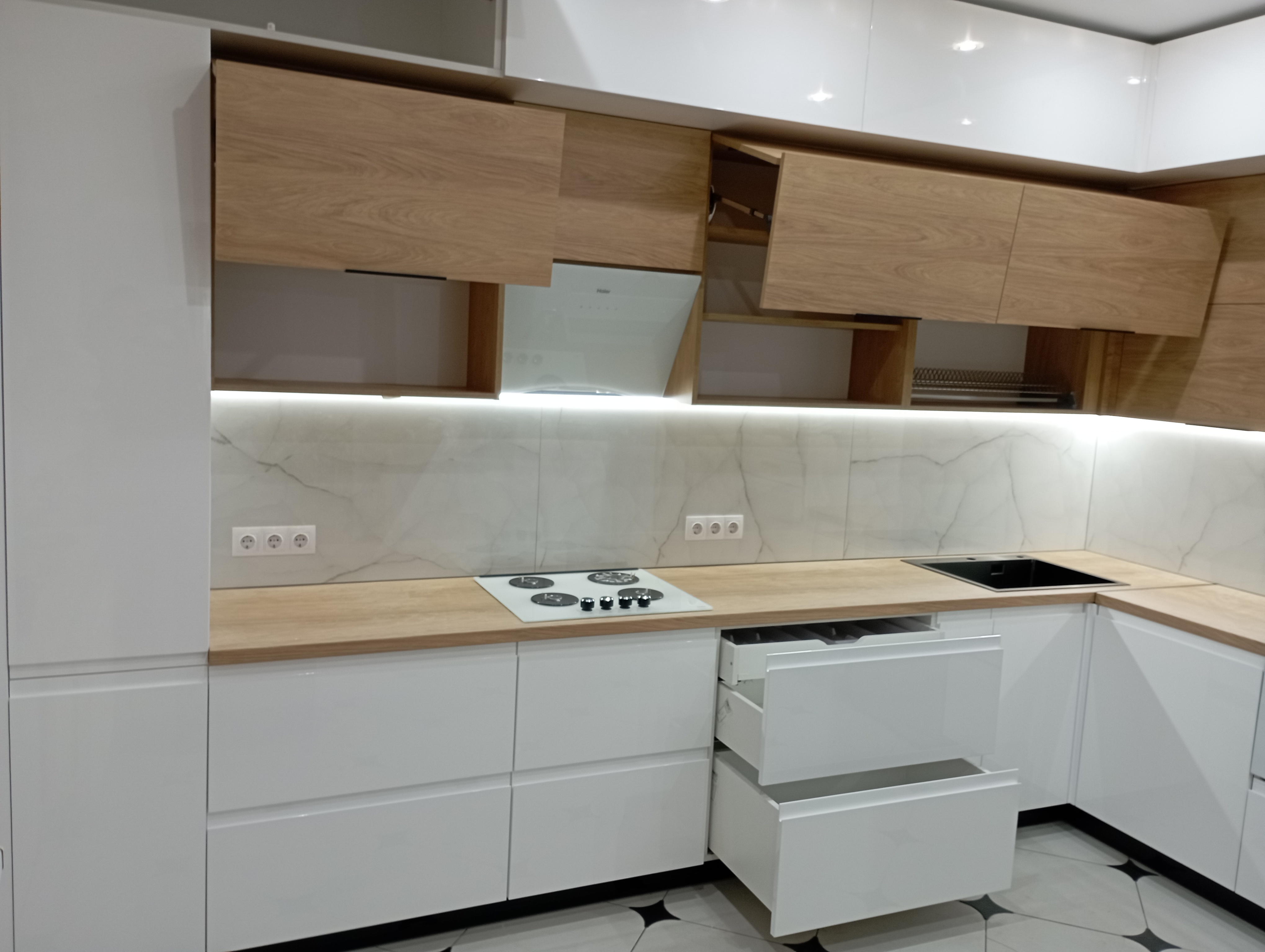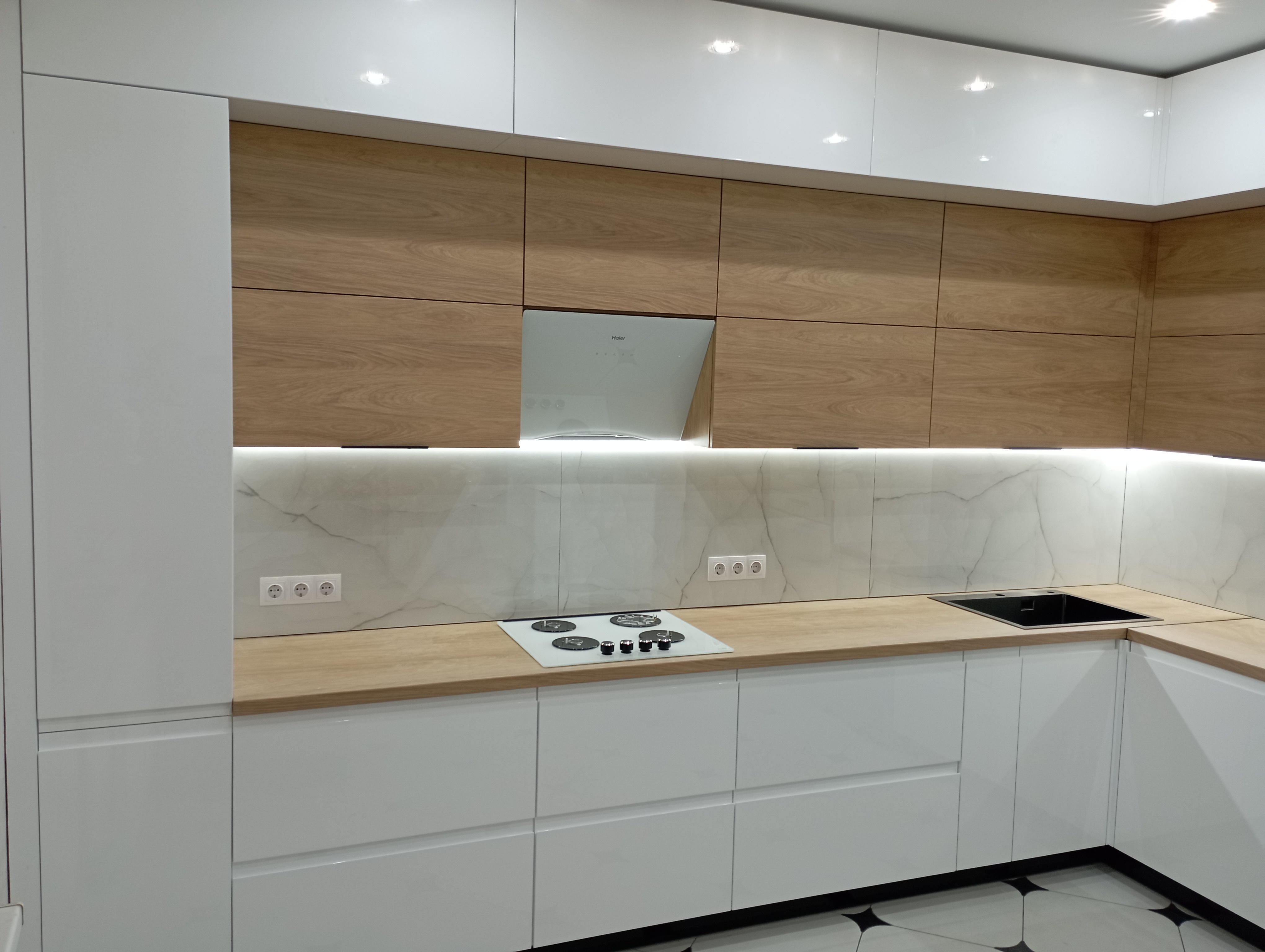 Современная линейная кухня. Разные цветовые решения фасадов и столешницы.