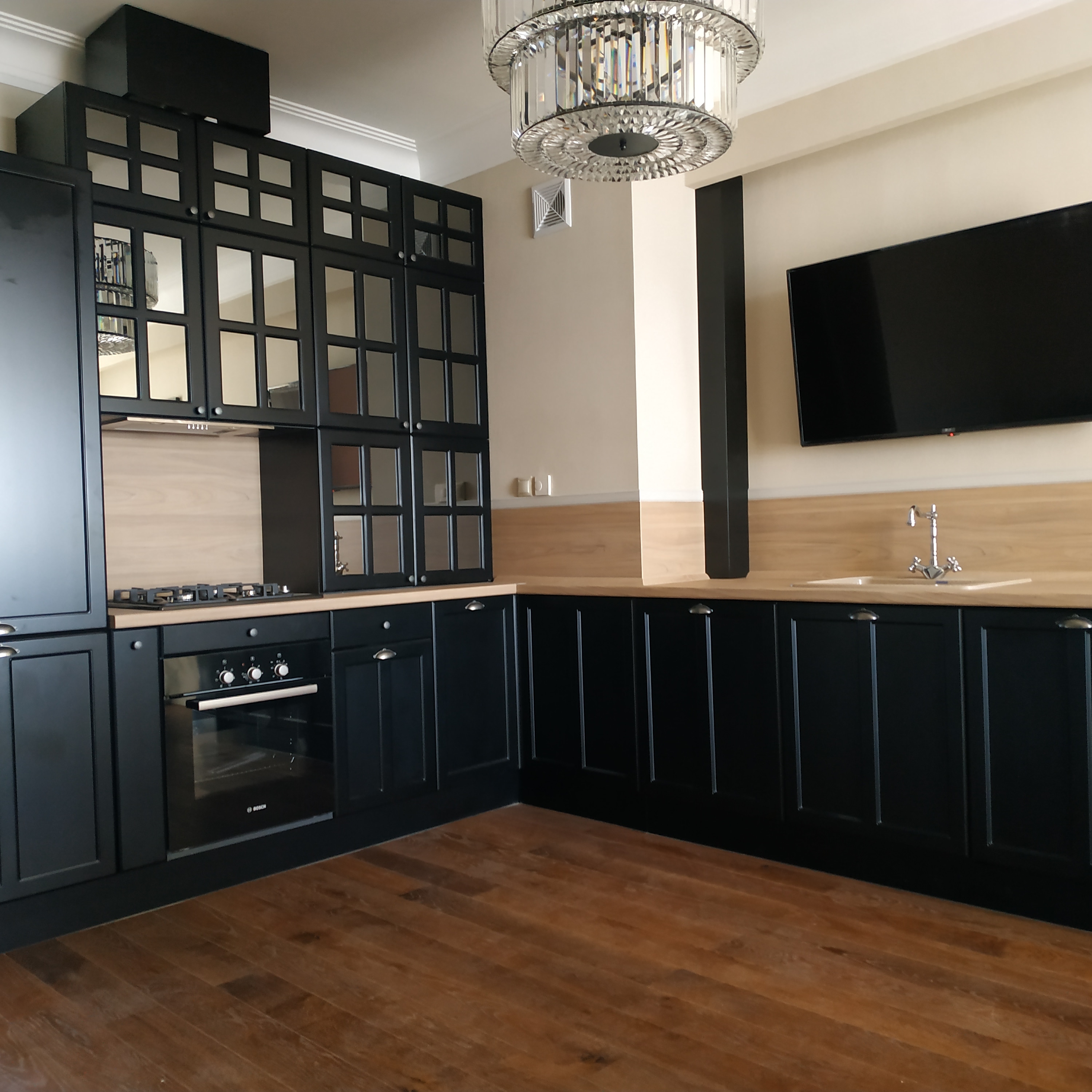 Угловая кухня с фасадами черного цвета