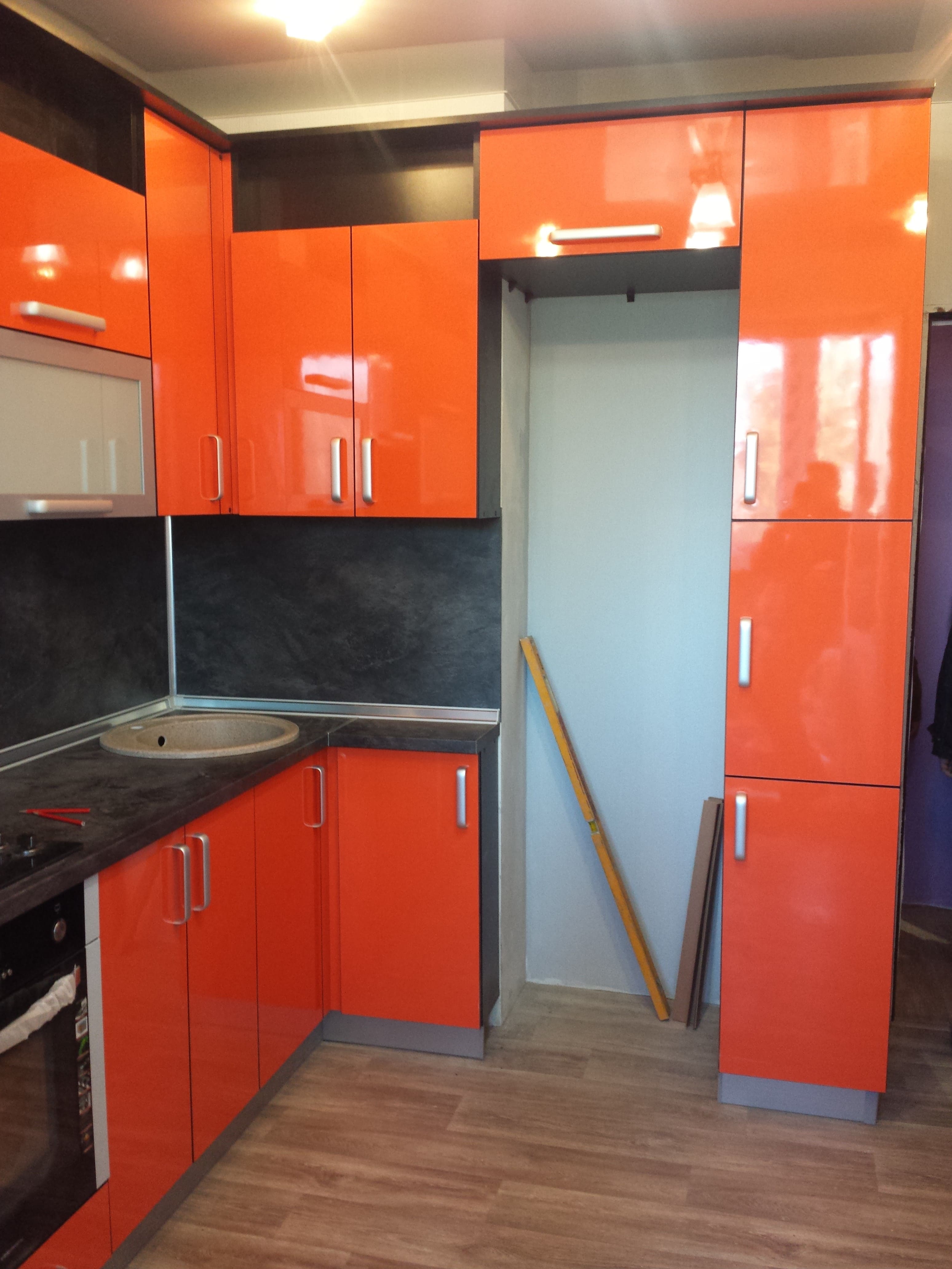 Угловая кухня от белорусской фабрики. Стильный цветовой контраст черного и красного.