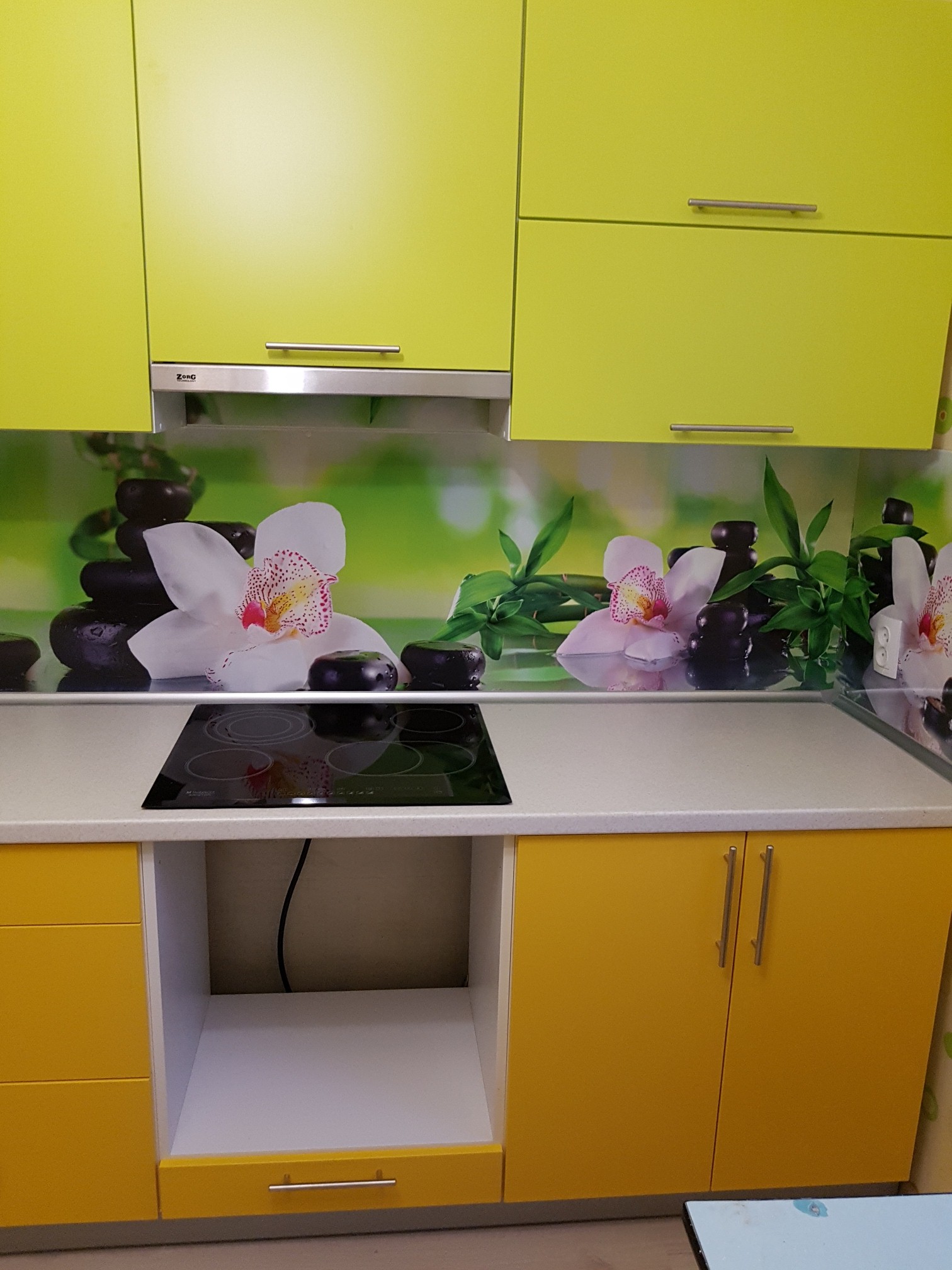 Верхние фасады со стеклом. Ширина кухни 200 см.