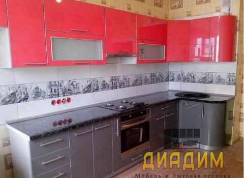 При оплате наличными скидка 20%. Цена со скидкой от 534.00 руб за 1 м.п. Угловая кухня с контрастным цветовым сочетанием фасадов.Имеет радиусное закругление.Основное расположением шкафов вертикальное.Хромированная
