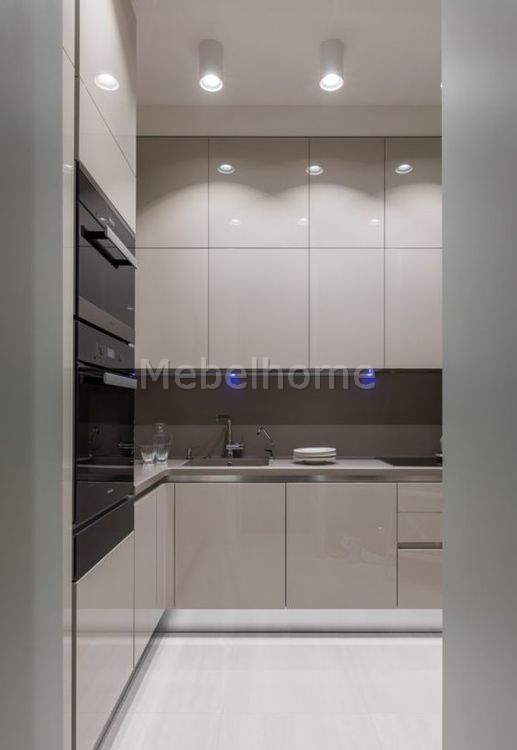 Современная угловая кухня с глянцевыми фасадами без ручек