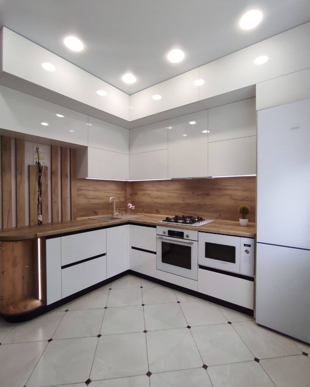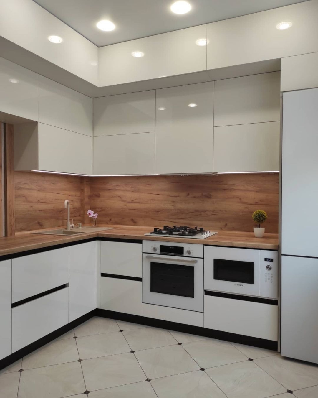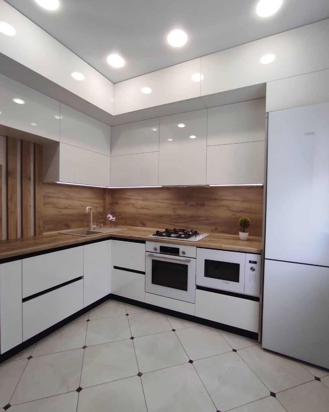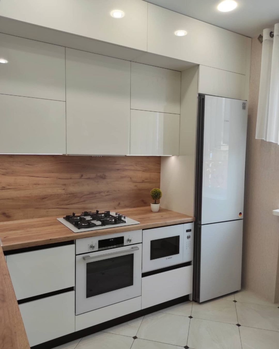 Верхние фасады со стеклом. Ширина кухни 230 см.
