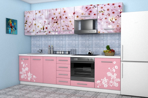 Угловая кухня представлена в стильном дизайне, ярким элементом в котором выступает изображение цветущей японской вишни сакуры на верхних шкафчиках. Светло-бежевая столешница из толстой ДВП прекрасно гармонирует с цветом верхнего модуля. Имеется в комплекте несколько выдвижных ящиков, предназначенных для хранения столовых приборов.