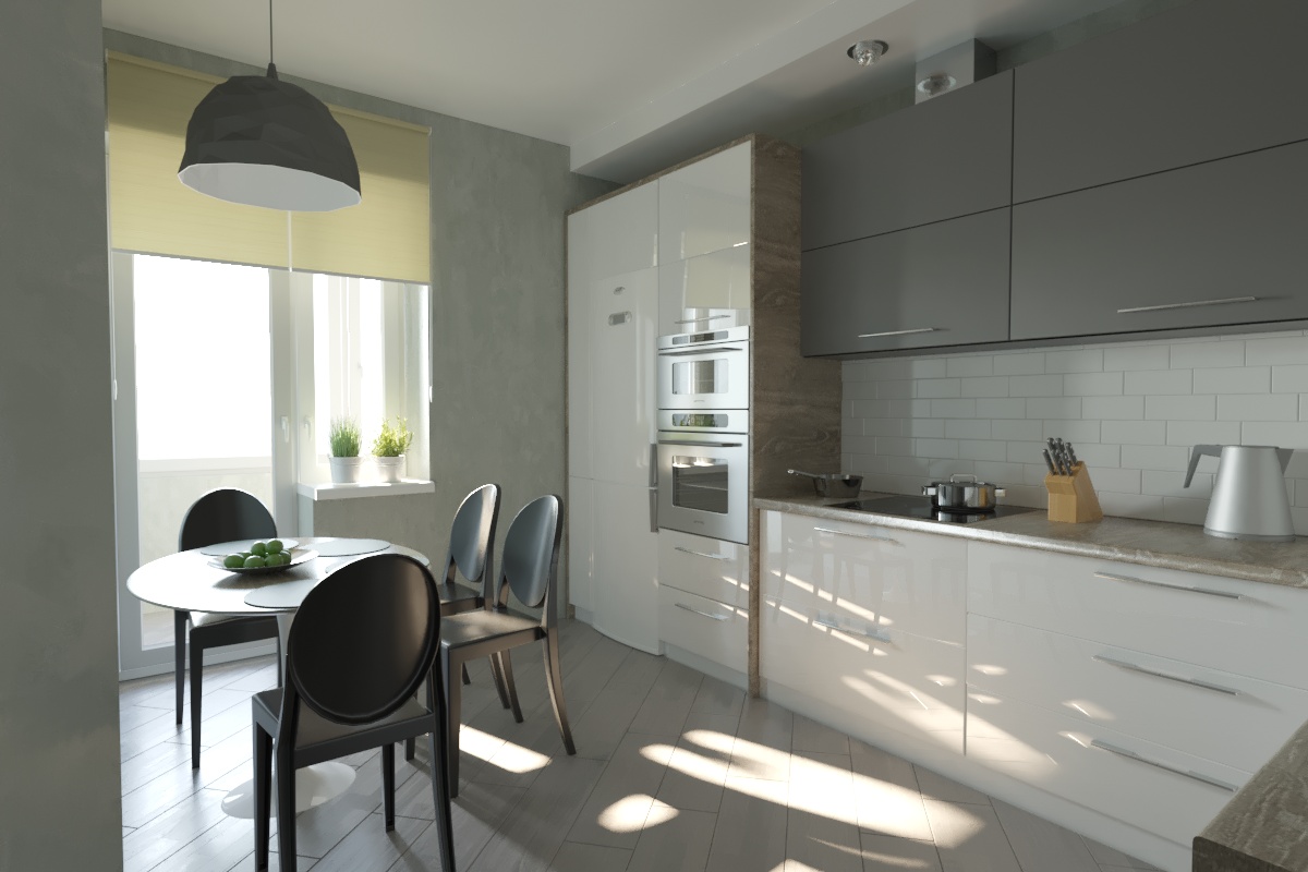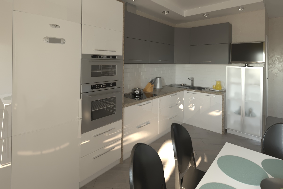 Габаритная угловая кухня позволит готовить с комфортом и удобством. Данный кухонный гарнитур рассчитан на более габаритные помещения. Напольные шкафчики и модуль для встраиваемой техники выкрашен в белом глянцевом цвете, а навесные шкафчики в серый матовый цвет. Большой модель для встраиваемой техники позволит максимально быстро приготовить большее количество блюд.