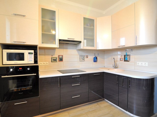 Стильная угловая кухня из пластикового МДФ выполнена в элегантном дизайне. Фасады выполнены в спокойных комбинированных тонах, способствующих созданию спокойной и творческой обстановки на кухне. Верхний модуль гарнитура частично остеклен и оборудован большим количеством шкафчиков для хранения кухонной утвари и посуды. Гарнитур оснащен дополнительным модулем для встраиваемой техники.