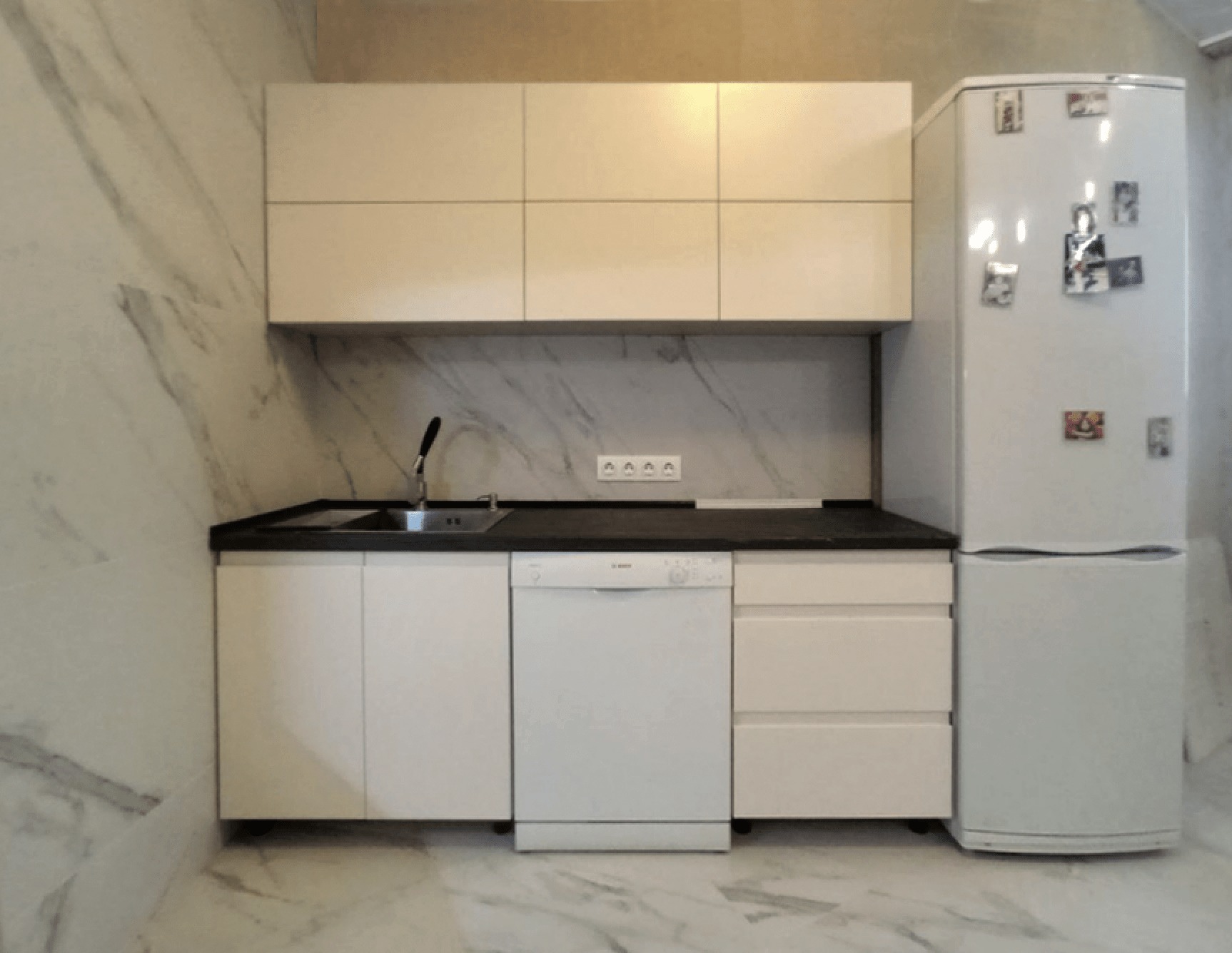Готовый гарнитур с комбинированными фасадами из ЛДСП. Ширина кухни 170 см.