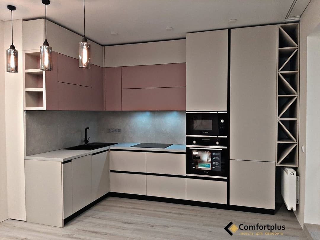 Островная кухня в стиле минимализм с матовыми фасадами без ручек из крашенного МДФ.