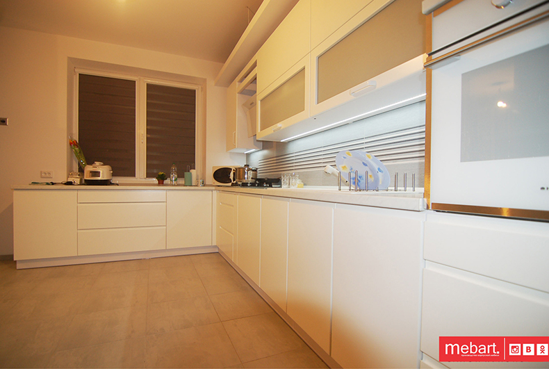 Вместительная угловая модель подойдет для обустройства просторной кухни. Большое количество шкафчиков и выдвижных ящиков позволит хранить в комфорте и всегда под рукой все необходимые кухонные принадлежности. Два подвесных шкафчика украшают небольшие полупрозрачные вставки с матовой поверхностью.