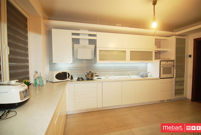Готовый гарнитур с комбинированными фасадами из ЛДСП. Ширина кухни 220 см.
