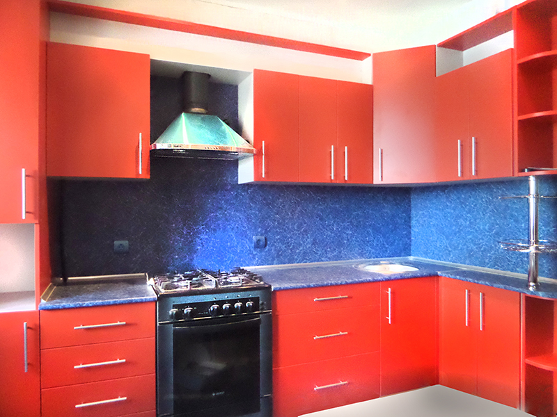 Угловая кухня отличается функциональностью и практичностью. За счет яркого цвета фасадом кухня займет в вашем доме центральное место, украсив собой интерьер любой комнаты. Среди многочисленных преимуществ значится наличие небольшой металлической стойки для бокалов и фруктов и нескольких открытых полочек.