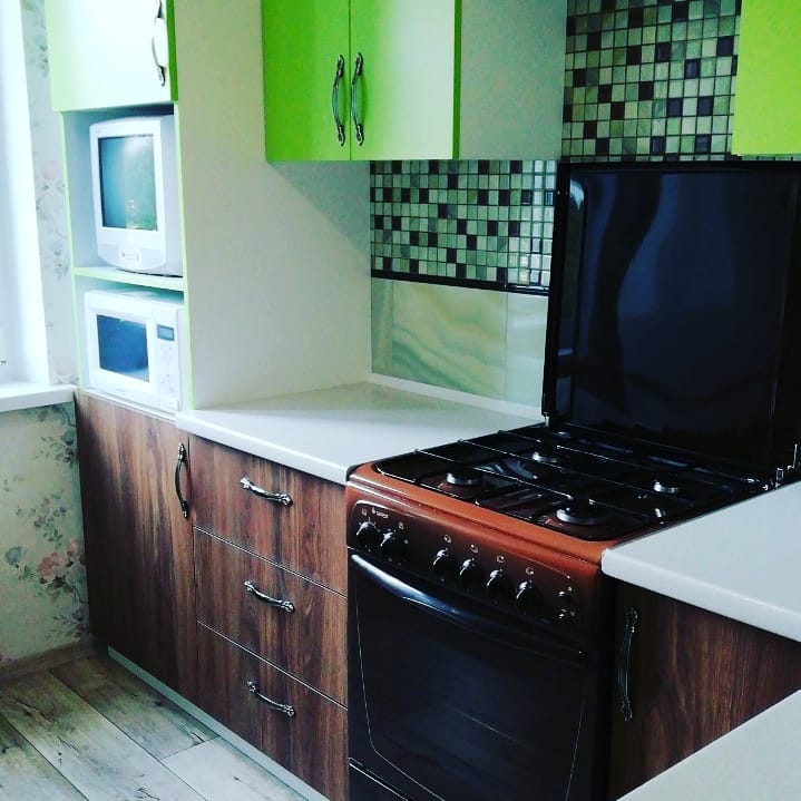 Кухня малогабаритная с двумя рядами навесных шкафов.