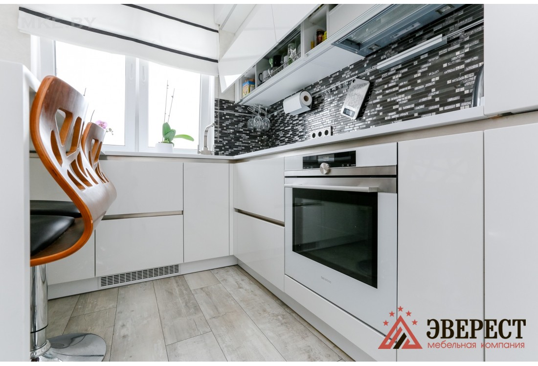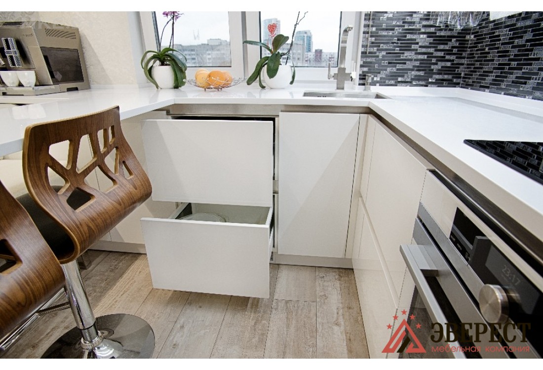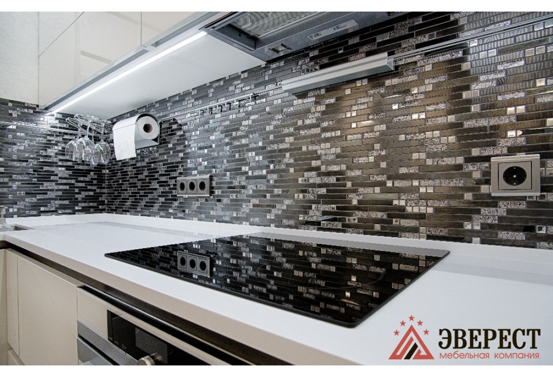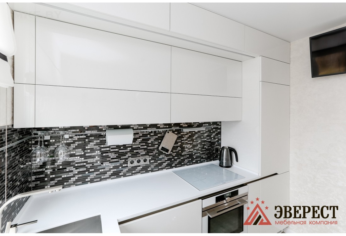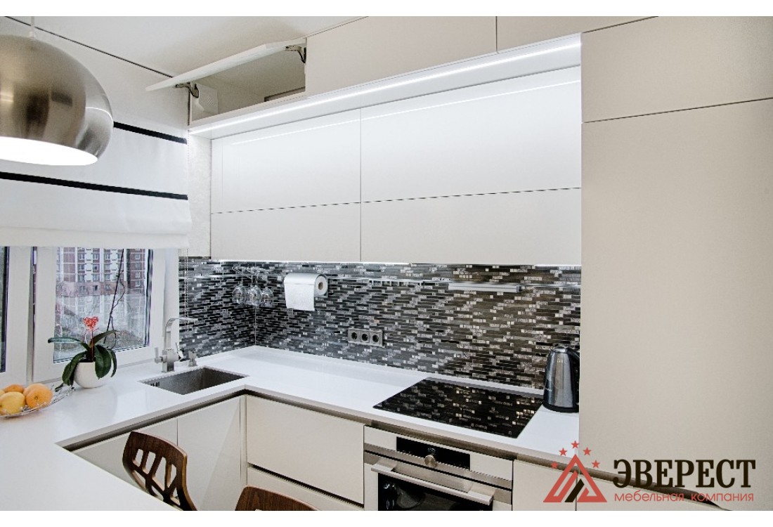 Угловая кухня с обеденной зоной оформлена в белом глянцевом цвете. Благодаря белому цвету создается визуальный эффект увеличения пространства. Фасады изготовлены из крашеного МДФ. Материал прост в уходе, не выделяет вредных веществ, устойчив к влаге и высокой температуре. Модель оснащена надежной фурнирой Blum. Кухонный фартук выполнен в виде мозайки, а подсветка рабочей зоны подчеркивает интерьер кухни.