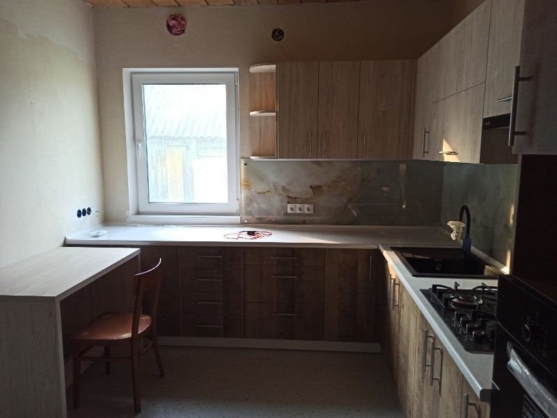 Белые фасады с фрезеровкой. Ширина кухни 150 см.