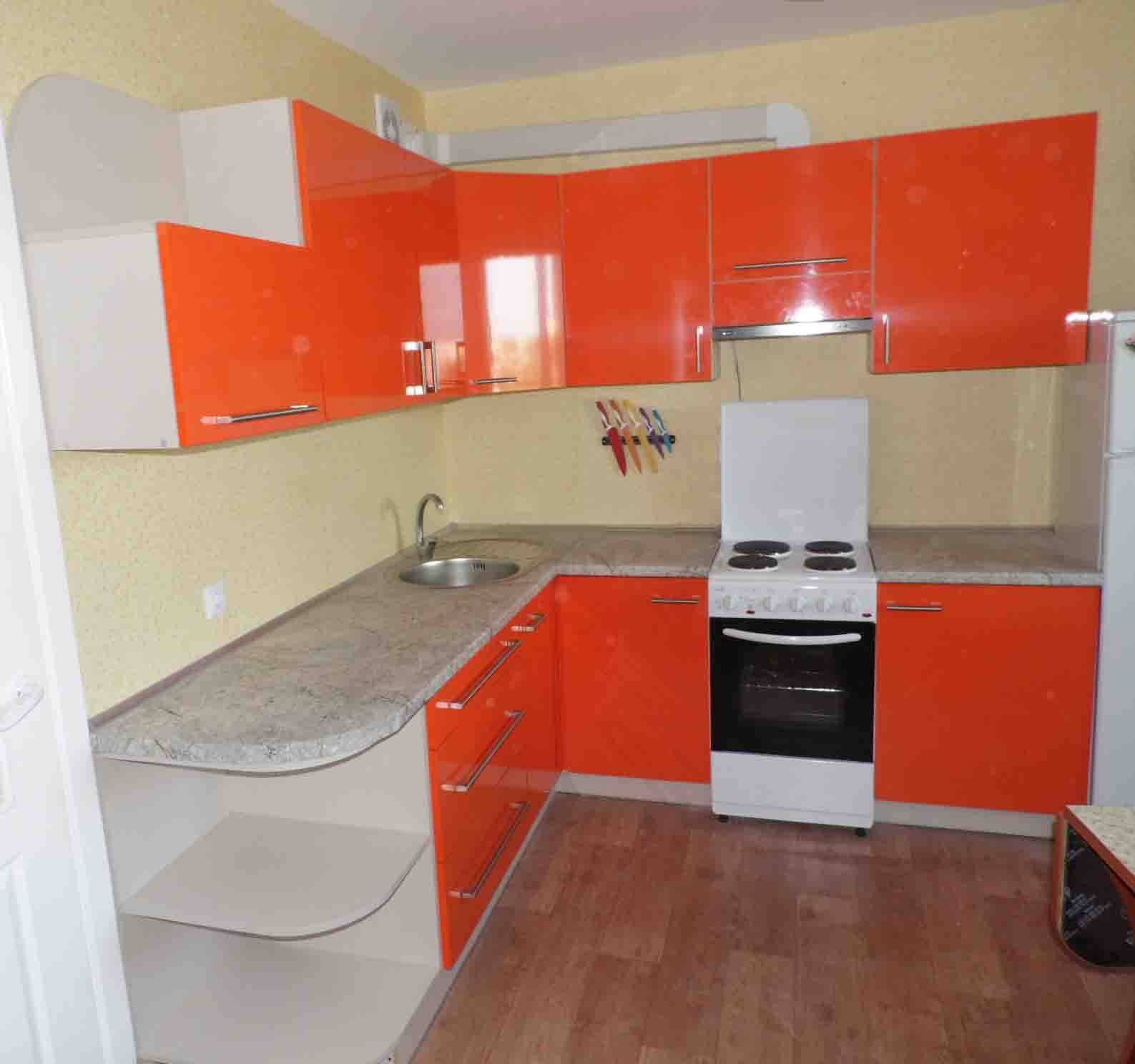 Угловая кухня имеет глянцевые фасады оранжевого цвета. Боковина нижней части дополнена двумя радиусными полками. Угловая часть верхушки оснащена открытой полкой с закругленной стенкой.