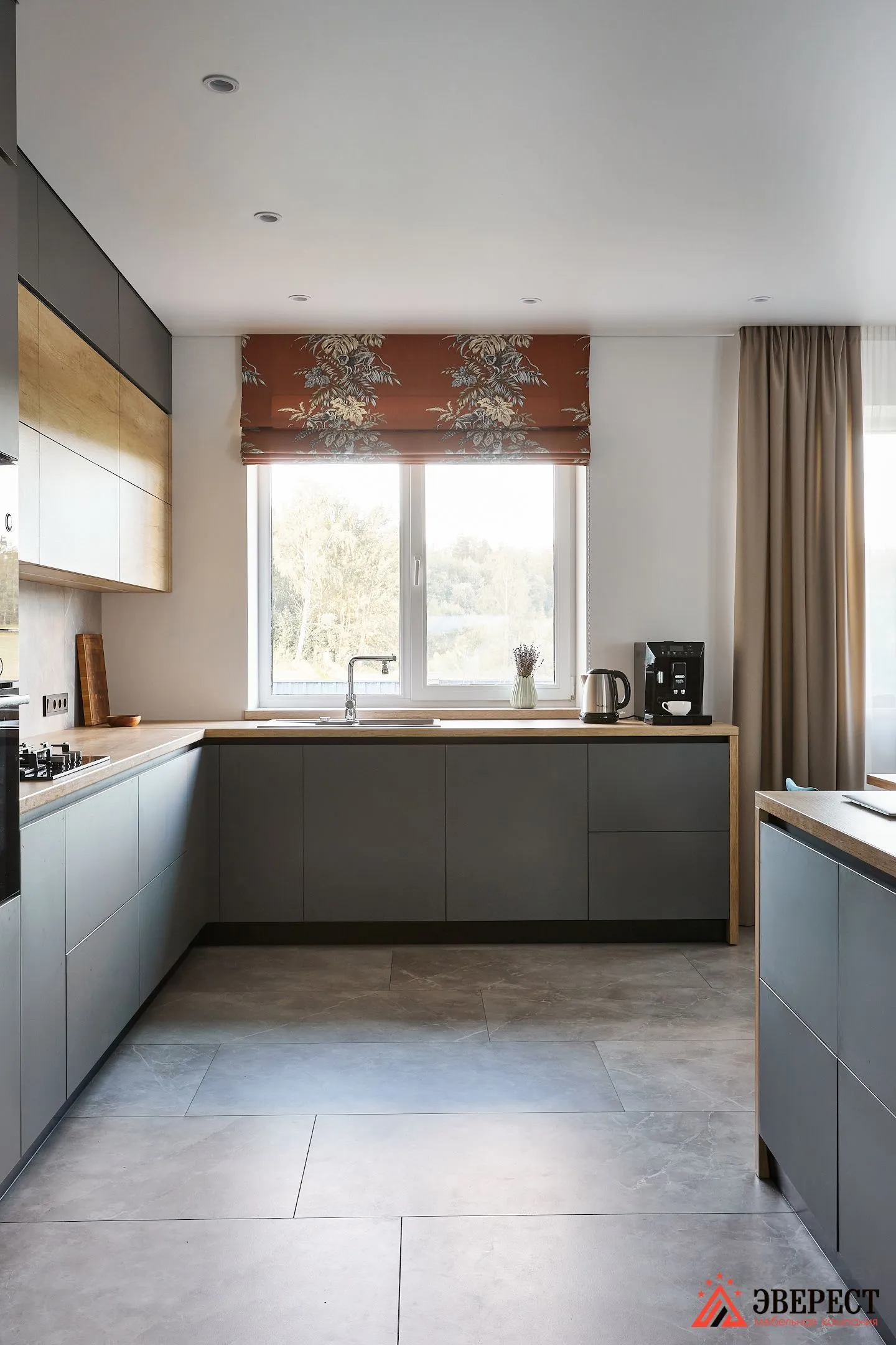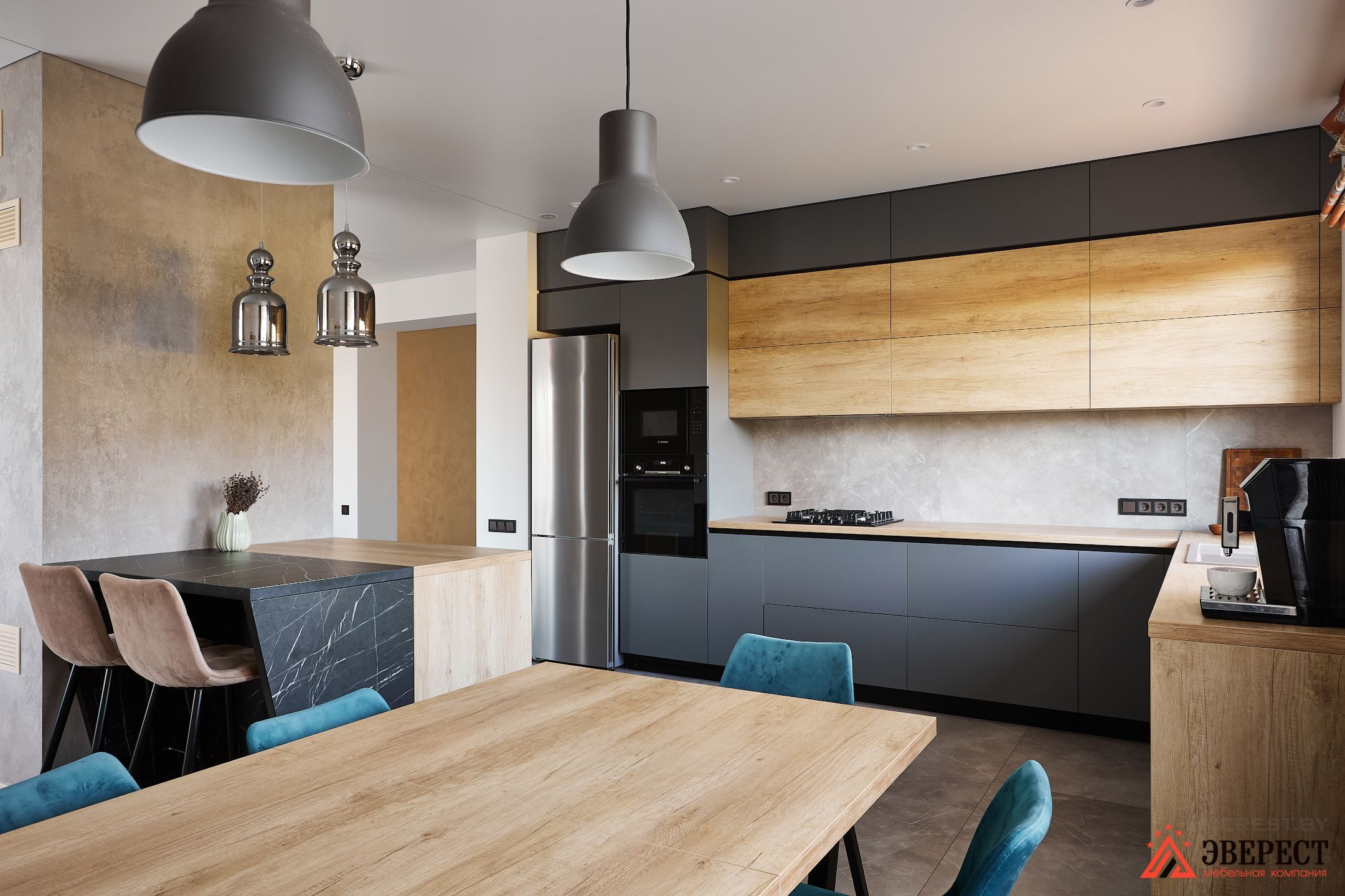 В этой кухне мы действительно сочетаем 3 самых популярных материала: матовые фасады, дерево и камень. А теперь по порядку.