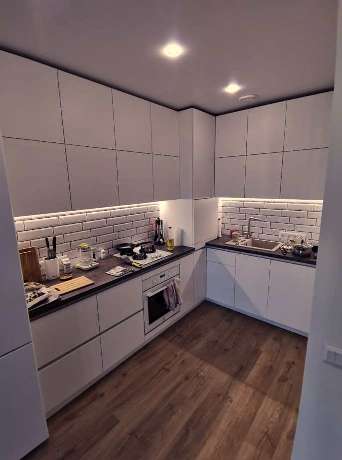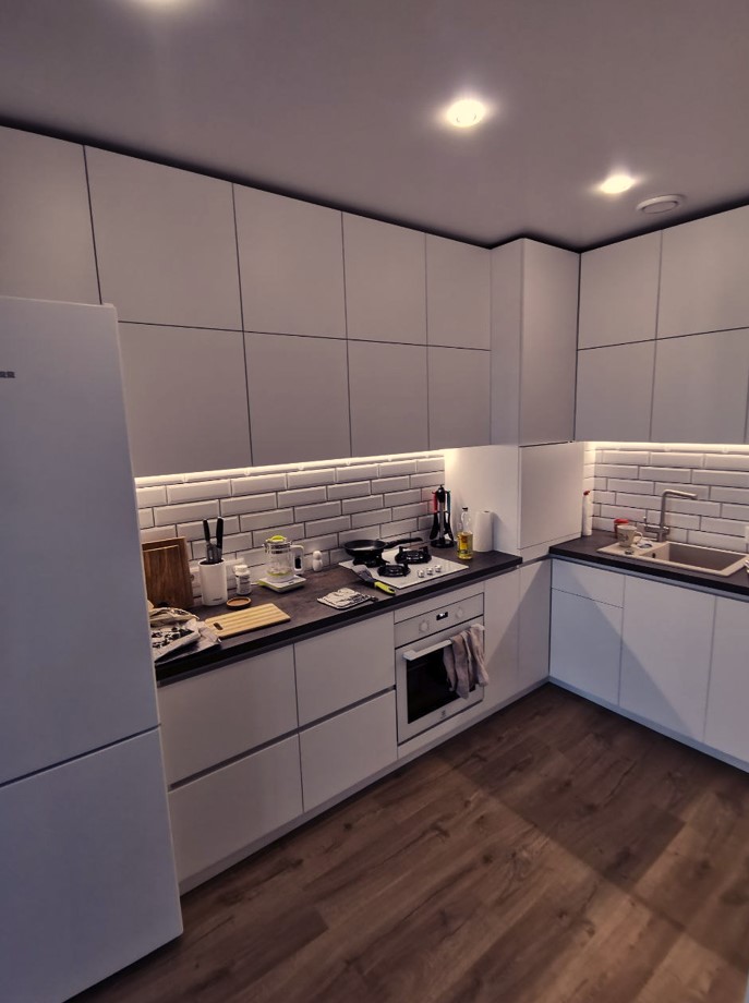 Белые фасады с фрезеровкой. Ширина кухни 150 см.