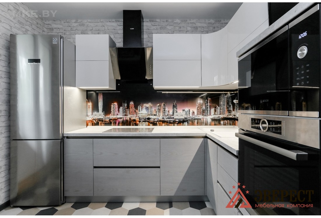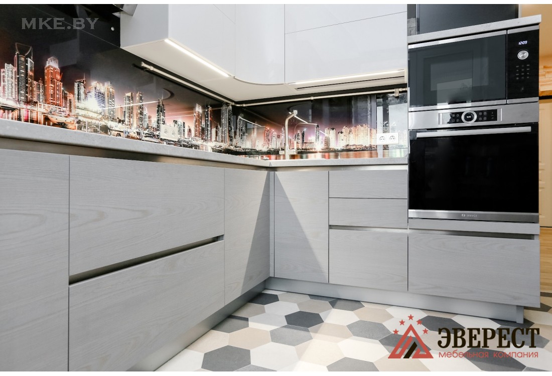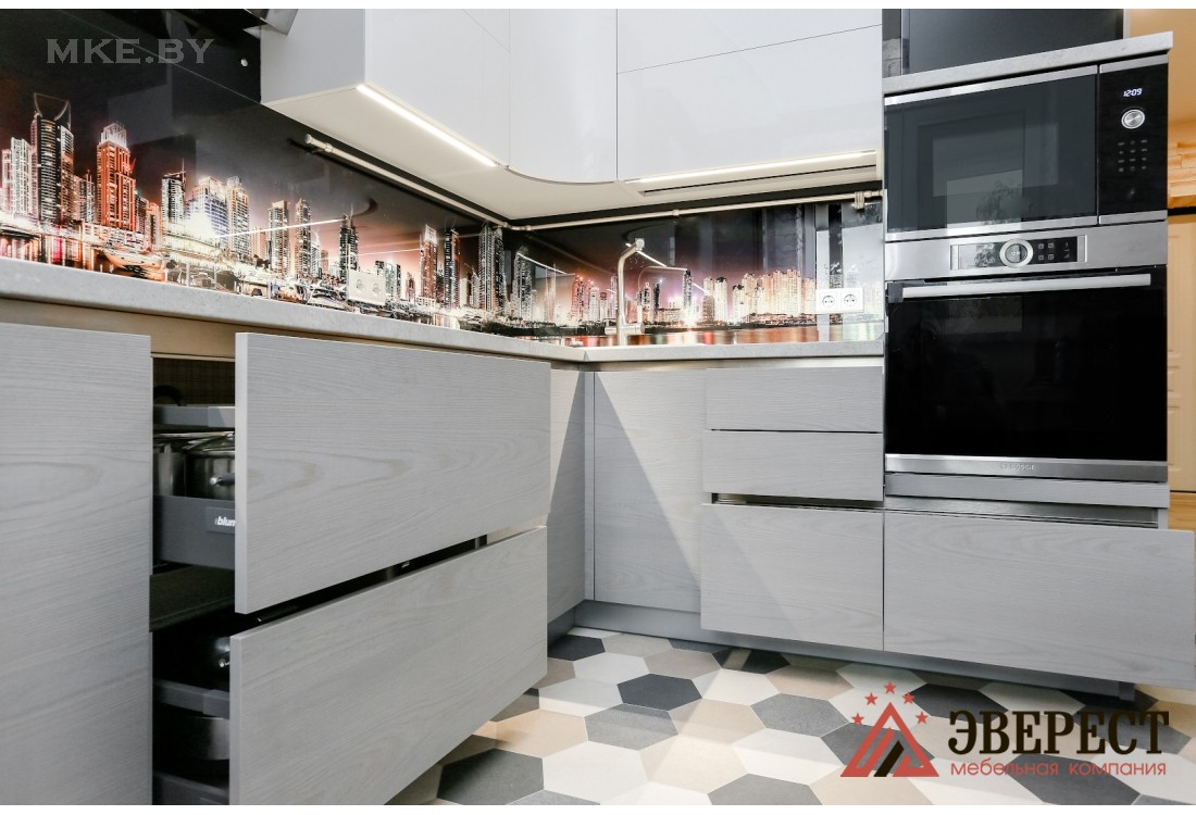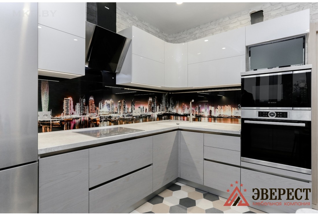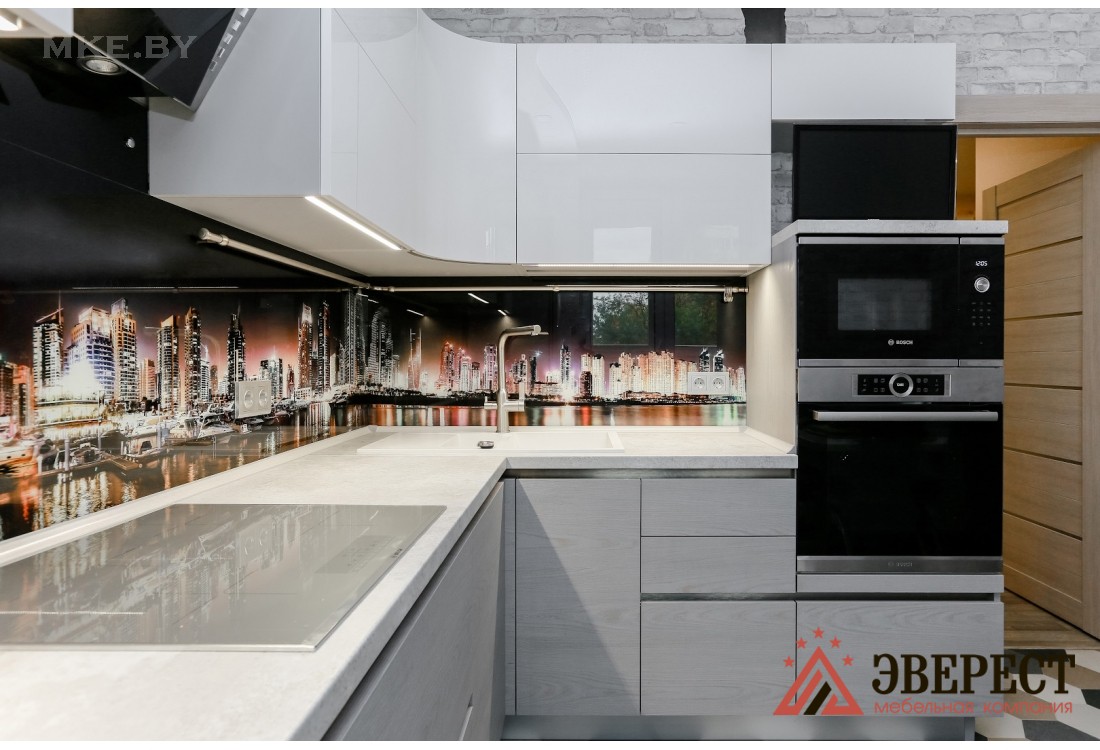 Представленная модель угловой кухни исполнена в белом глянце. Фасады изготовлены из акрила, материал выдерживает любые механические повреждения, не реагирует на перепады температур, не плавится, прост в уходе. Конструкция кухни лишена ручек и оснащена подъемными механизмами и доводчиками. Оригинальность кухне придает скиналь с фотопечатью. Под глянцевыми фасадами расположилось освещение.