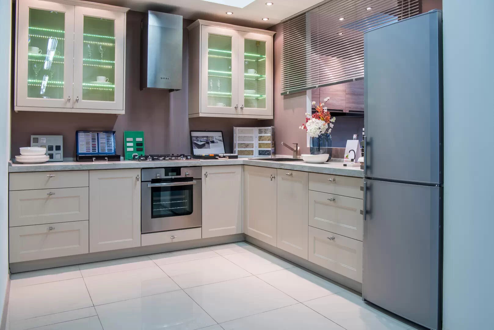 Светлые фрезерованные фасады. Ширина кухни 190 см.
