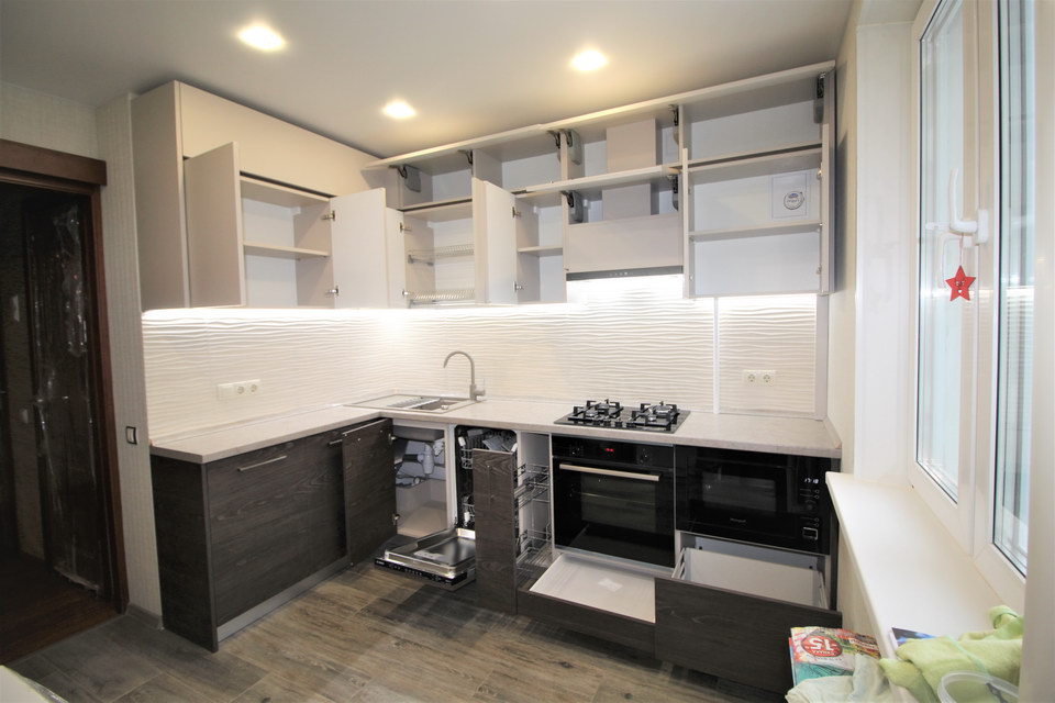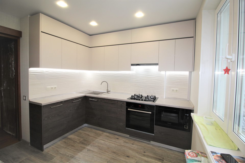 Современная угловая кухня с выдвижными ящиками, нишами для техники, вместительными шкафами с подъемно-откидными и распашными створками. Верхние фасады без ручек выполнены в белоснежном цвете, фасады напольных тумб имеют покрытие с имитацией дерева в серо-коричневом оттенке и комплектуются рейлинговыми ручками. Рабочая зона освещается при помощи встроенной в навесные шкафы подсветки.
