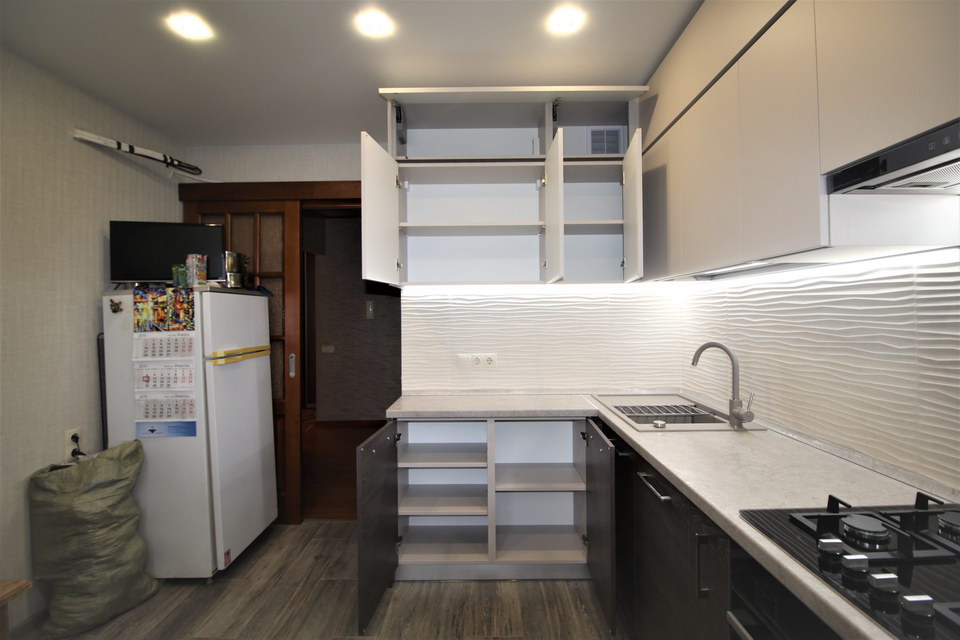 код 101235Светлая столешница из практичного материала. Верхние шкафы без ручек.