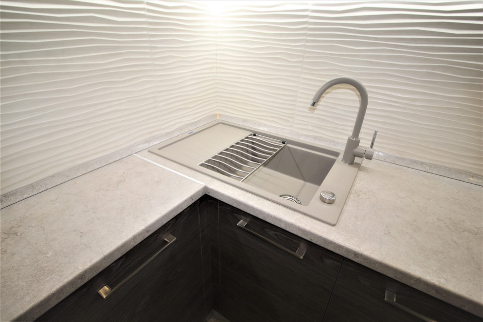 Множество зон хранения. Столешница с текстурой под мрамор.