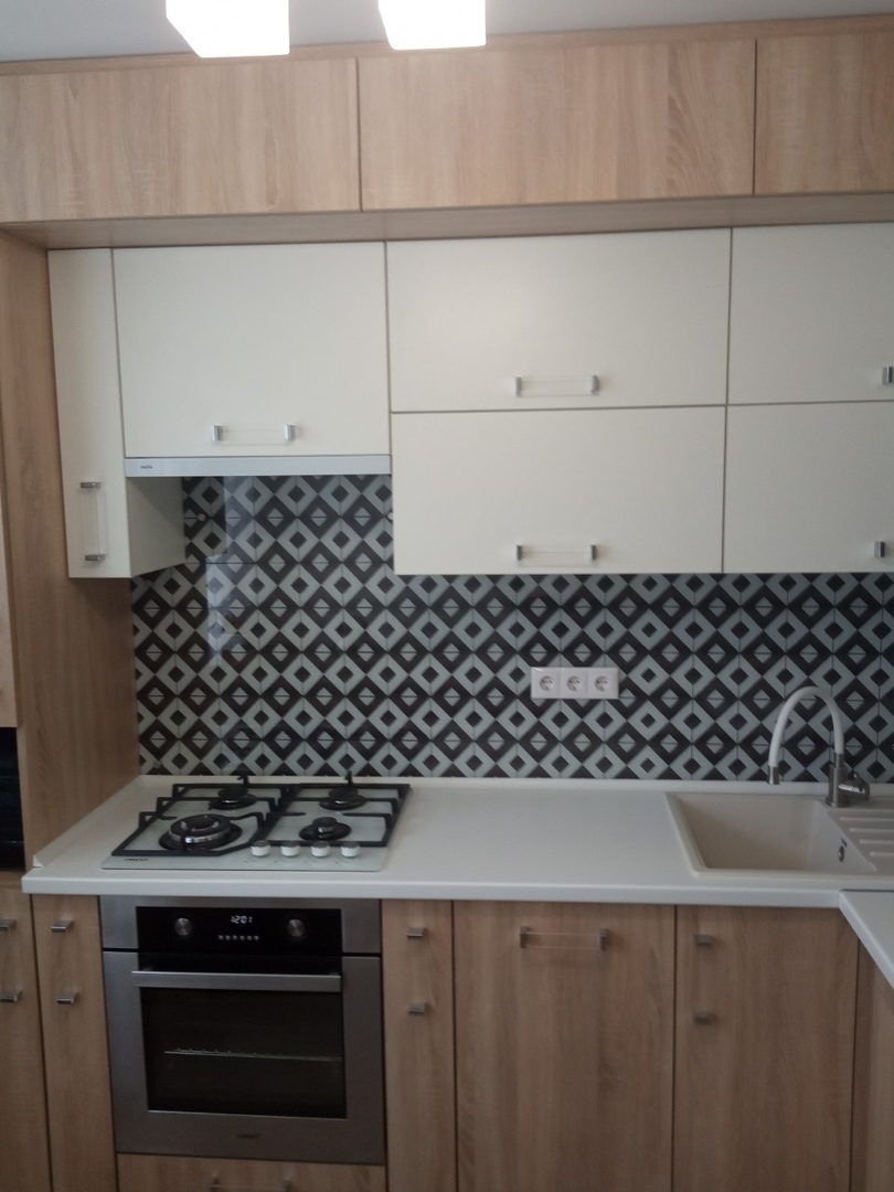 Двухметровая кухня с фасадами из ЛДСП двух цветов.