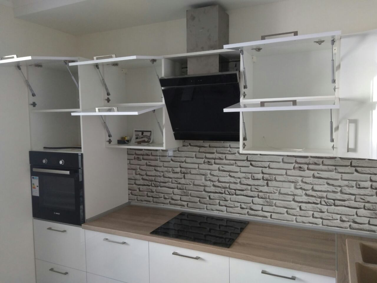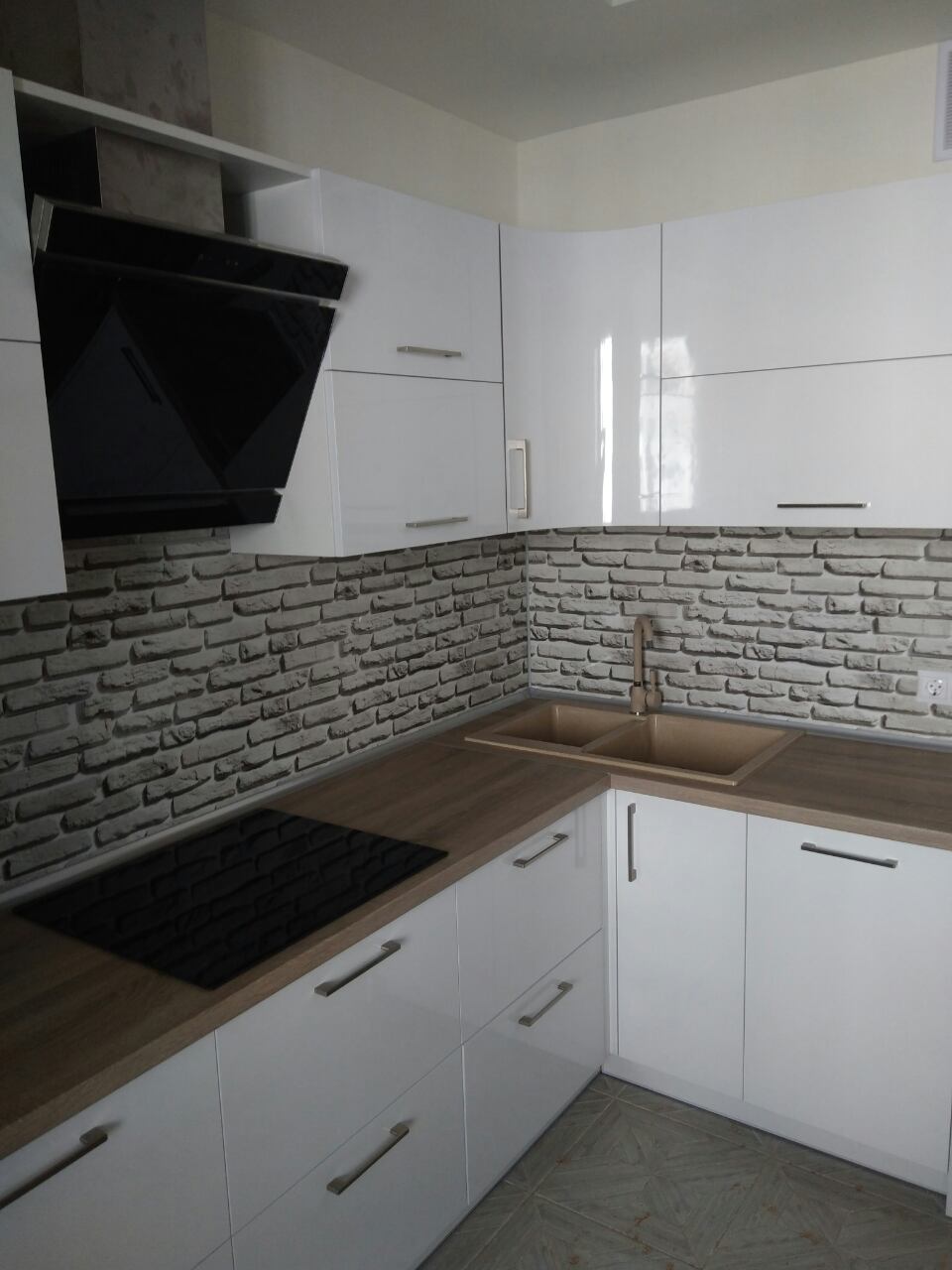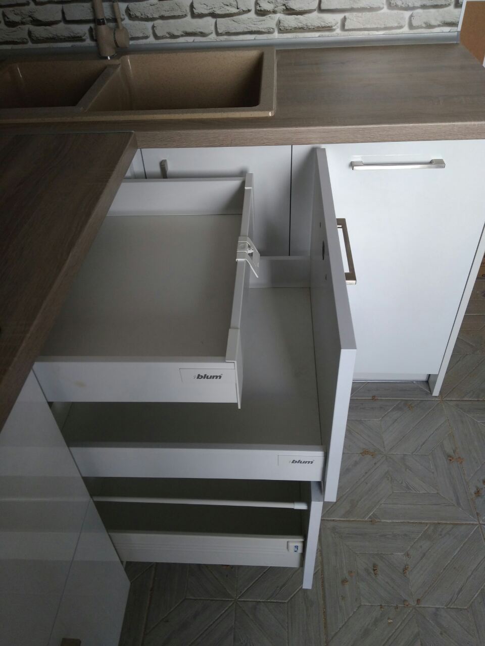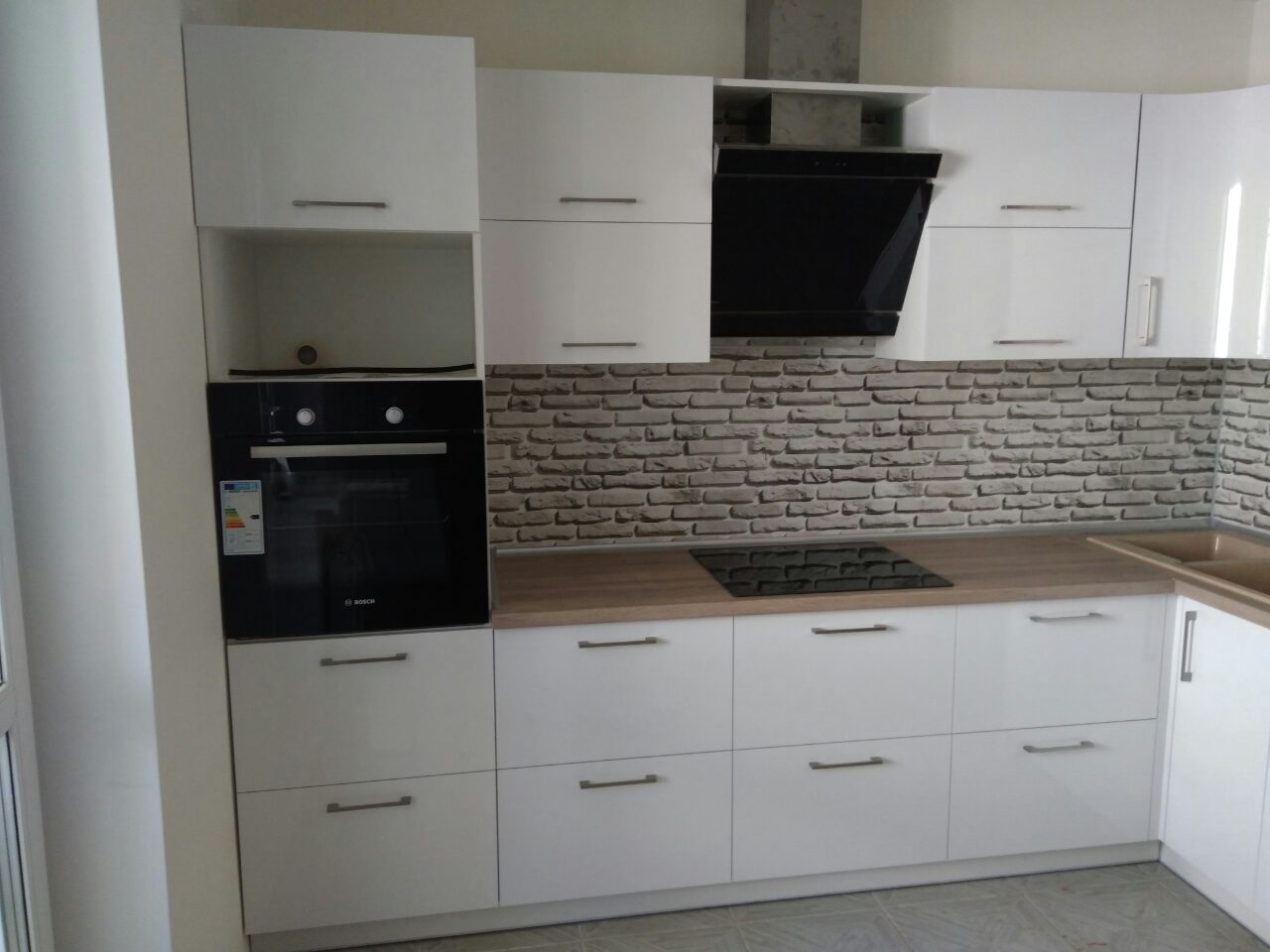 Угловой гарнитур удачно впишется в интерьер габаритной кухни. Модель представлена в глянцевом белом фасаде, который визуально освежает кухню. Ящики оснащены современными выдвижными механизмами, а дверцы навесного модуля оборудованы газлифтами. Кухня оборудована модулем для встраиваемой техники.