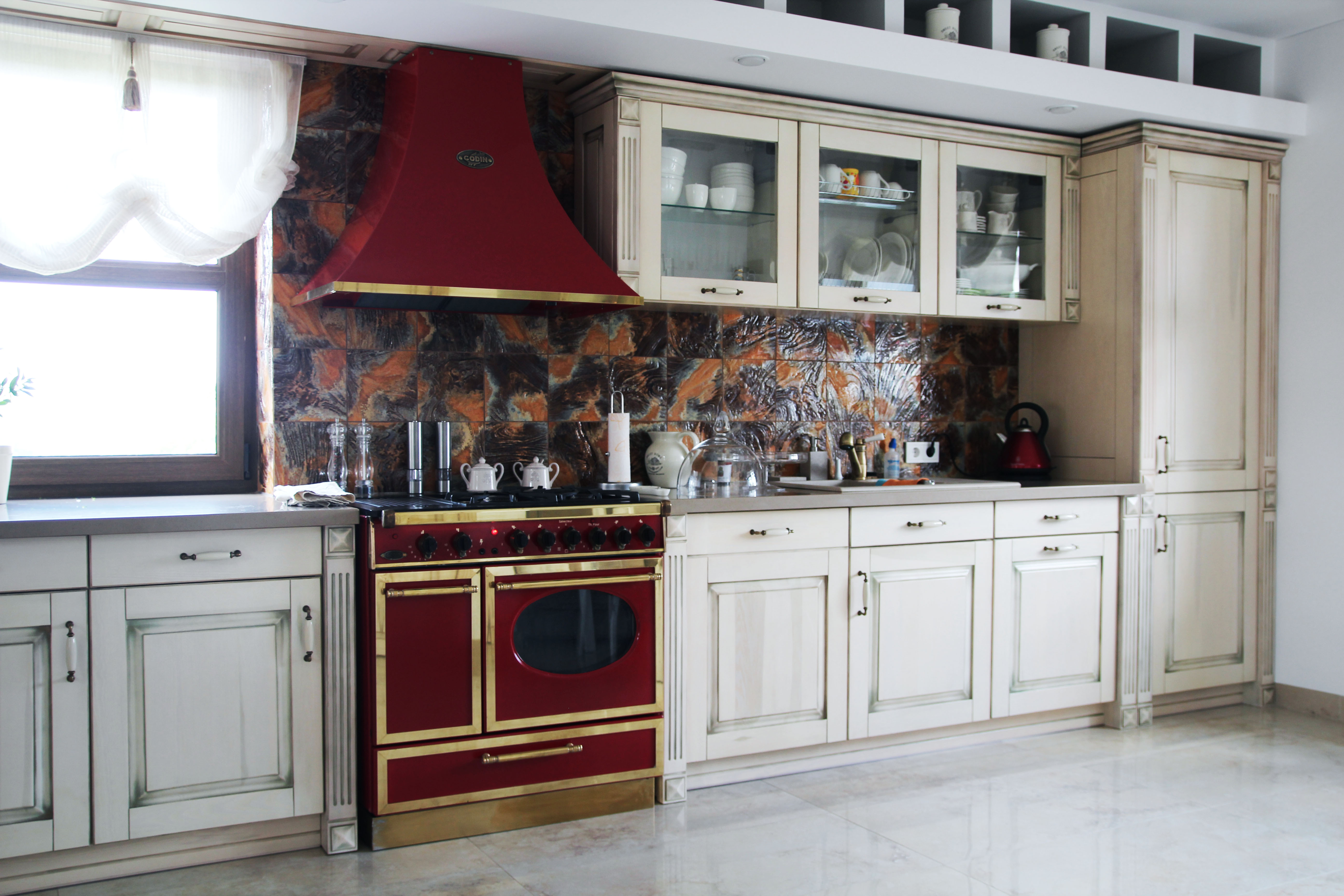 Элегантная кухня изготовлена в оригинальном дизайне с использованием патинирования. Верхние навесные шкафы остеклены, используется фурнитура с ручками. Фасады кухни выполнены в белом цвете с фрезеровкой дверей. Неотъемлемой частью кухни является встроенный в стену шкафчик со стеклянными полками, который отлично послужит для стеклянной посуды и бокалов.