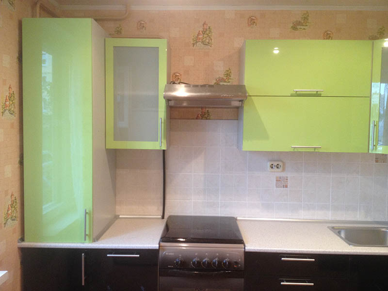 Угловая кухня выполнена в сочетании двух цветов удачно дополнит интерьер просторной и светлой комнаты. Створки напольных тумб исполнены в черном цвете, а фасад подвесных шкафчиков имеет нежный салатовый оттенок. Несколько подвесных модулей декорированы светлыми полупрозрачными вставками.