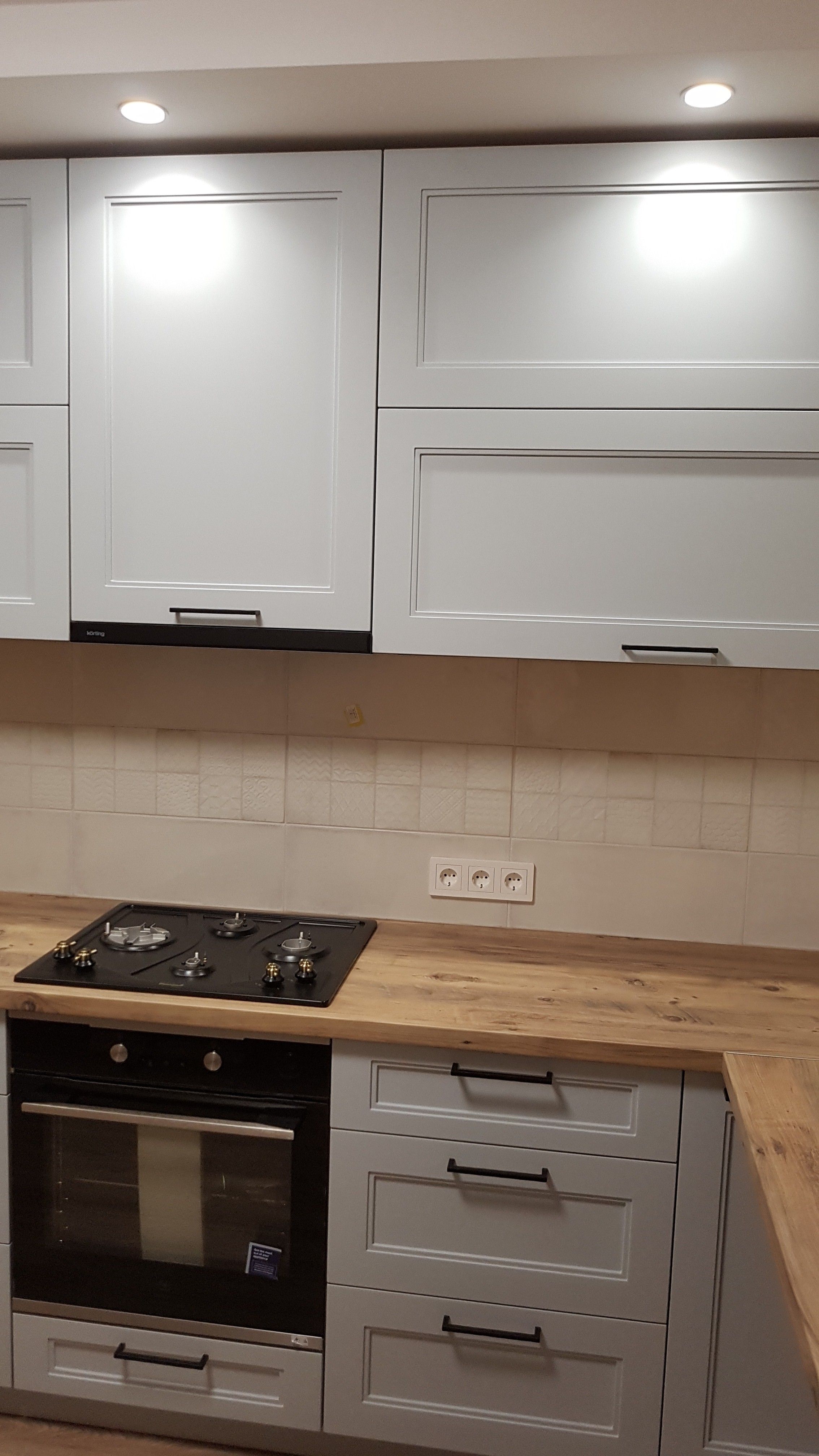Современный дизайн, врезная подсветка рабочей зоны, фасады без ручек.