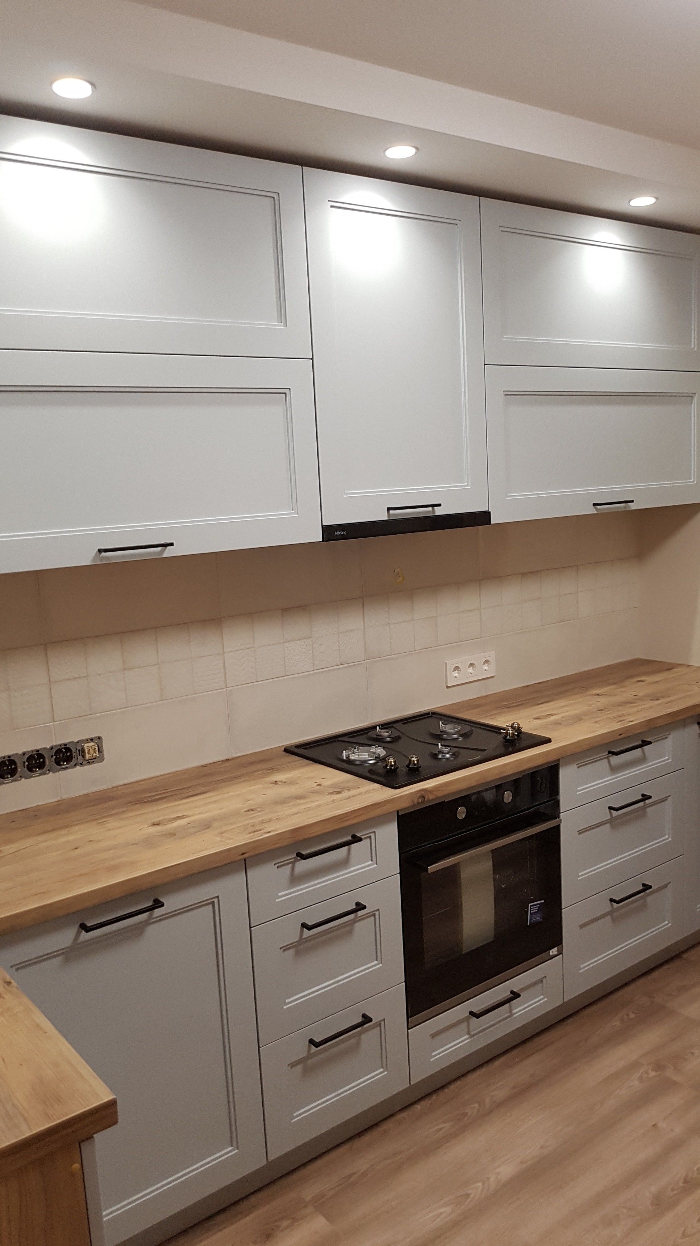 Готовый гарнитур с комбинированными фасадами из ЛДСП. Ширина кухни 120 см.