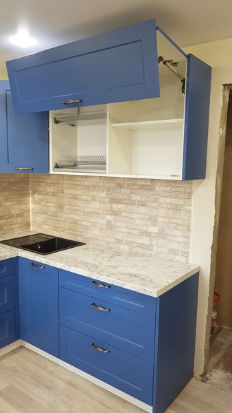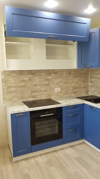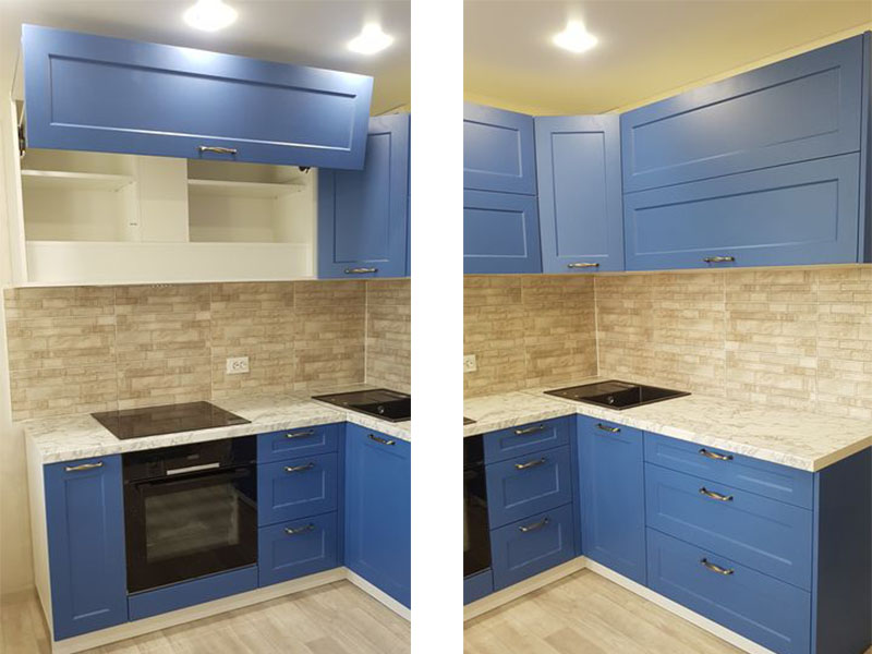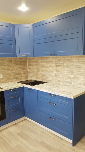 Угловая кухня с синими фасадами
