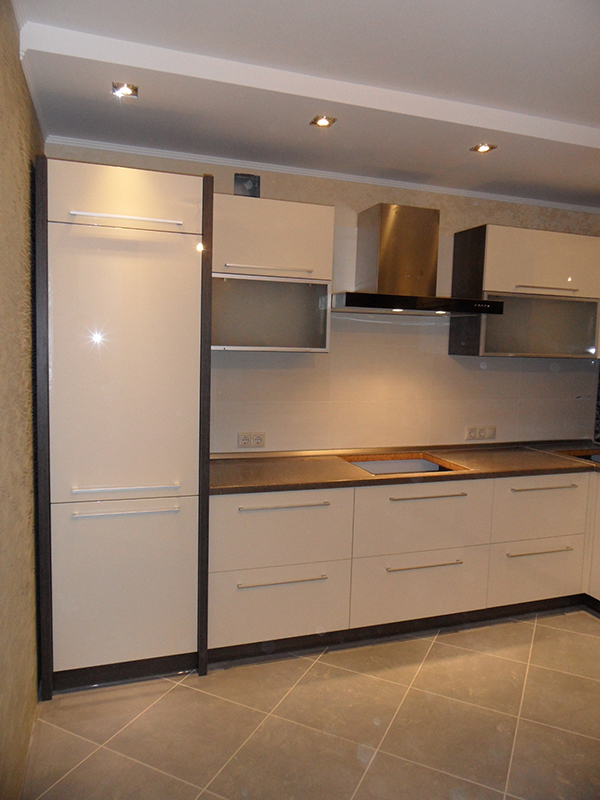Основу угловой кухни составляет прочный каркас цвета венге. Глянцевые белые фасады обеспечивают кухне неповторимый блеск и лаконичность дизайна, не обремененного лишними деталями. Створки шкафчиков верхних фасадов матовые, с инкрустацией планками.