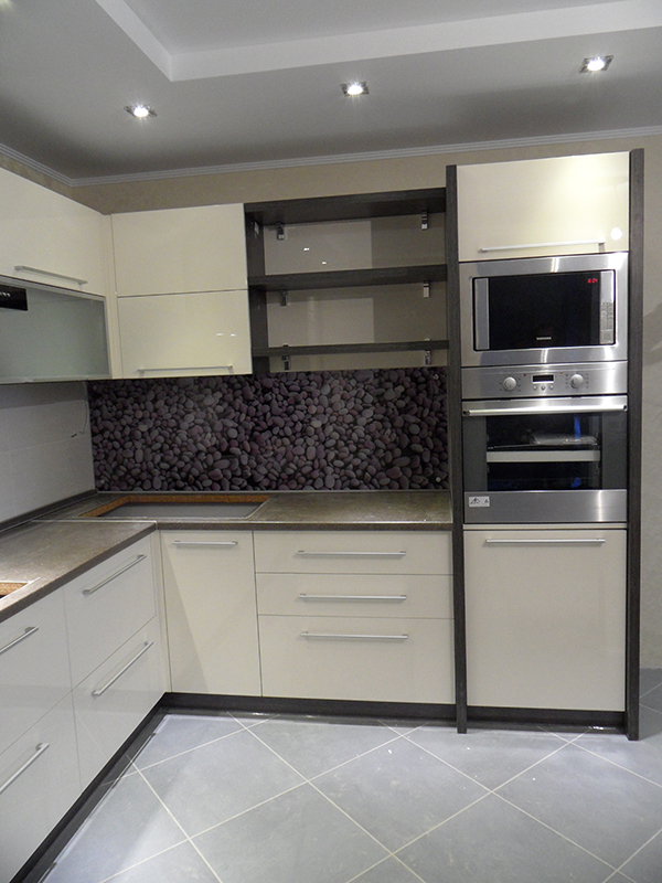 Вместительные фасады, ниши для встраиваемой техники, оригинальный фартук.