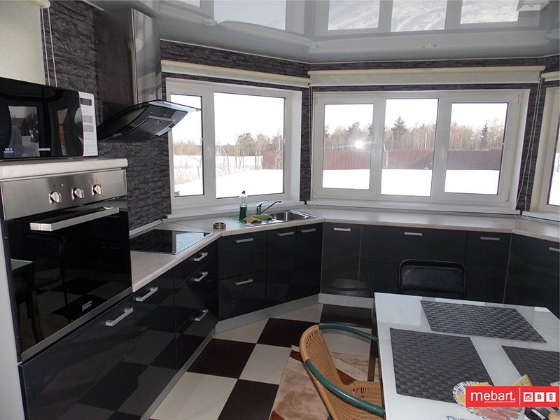 Представленная кухня — идеальный вариант для светлой и просторной комнаты. Шкафчики с темными створками располагаются полукругом, что придаст интерьеру кухни оригинальный вид. Светлая столешница из ударопрочного материала позволит с комфортом расположить продукты питания и кухонные принадлежности, необходимые для приготовления пищи.