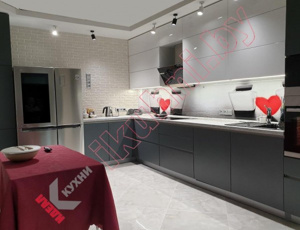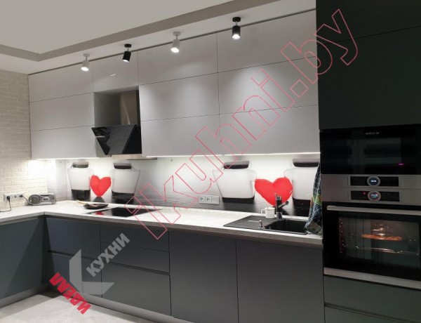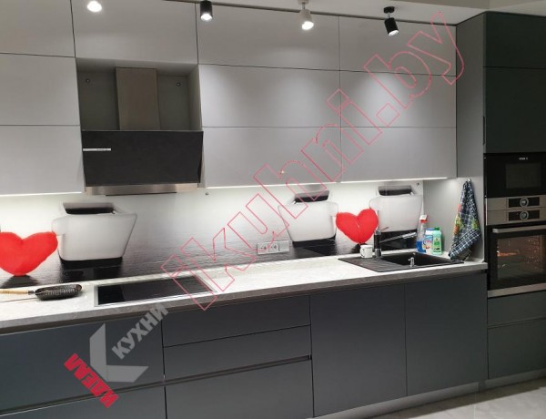 Верхние фасады со стеклом. Ширина кухни 220 см.