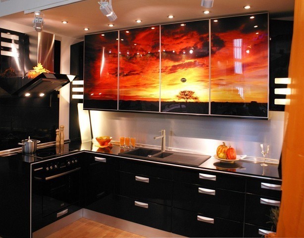 Современная черная кухня имеет угловую конструкцию,которая создает очень большую рабочую поверхность и многочисленные шкафы и ящики, а также ниши для всей необходимой встраиваемой техники. Фасад кухни может показаться довольно мрачным, однако он невероятно необычен и креативен за счет нанесенной фотопечати с изображением заката на поверхность верхнего модуля. Кухня имеет довольно крупные втопленные ручки и яркую подсветку.